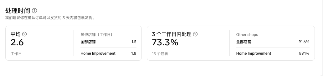 除了您自己的履行效率之外,此功能还可以让您更多地了解其他卖家的表现。您可以查看行业和平台的平均处理和运输时间。如果你的表现不如同行,你应该更加关注并改善客户的购物体验。