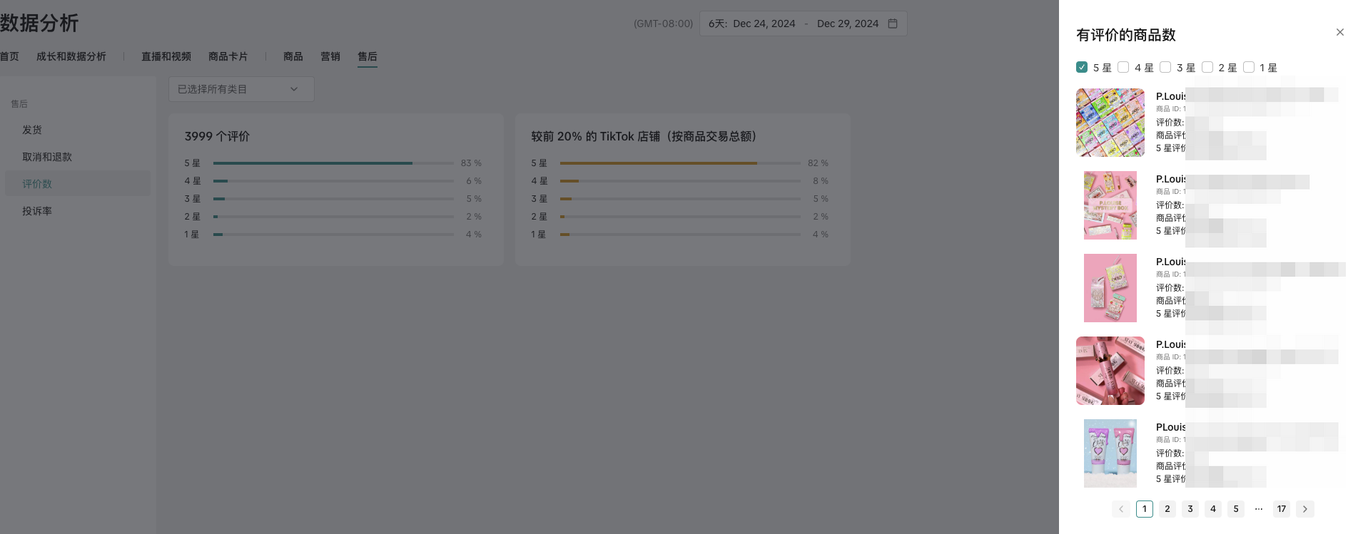 如果卖家发现商店中负面1星和2星评论的比例较高,可以点击评论部分,右侧会弹出这些产品的列表。这显示了产品评论的数量、这些产品评论占评论总数的比例,以及该产品的评分占评论总数的比例。
