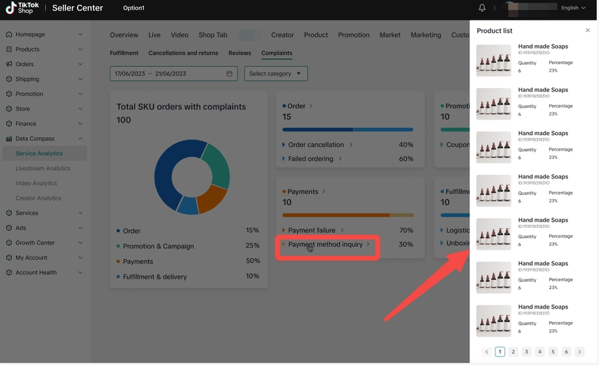 - 当您点击各投诉区块中各级别的投诉名称时,页面右侧会出现相关产品列表,包括产品名称、产品ID、投诉SKU订单(数量)、投诉SKU占比订单(总数加起来为100%)。您可以确定哪些产品有更多投诉问题,然后采取措施提高商店的业绩。