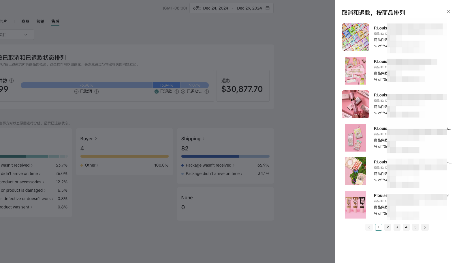 当您点击各进度条图表中的取消退货责任或原因时,页面右侧会出现相关产品列表,包括产品名称、产品id、取消退货商品以及各商品所占的份额。您可以识别哪些产品存在更多问题,然后采取措施改善您商店的交易后服务。