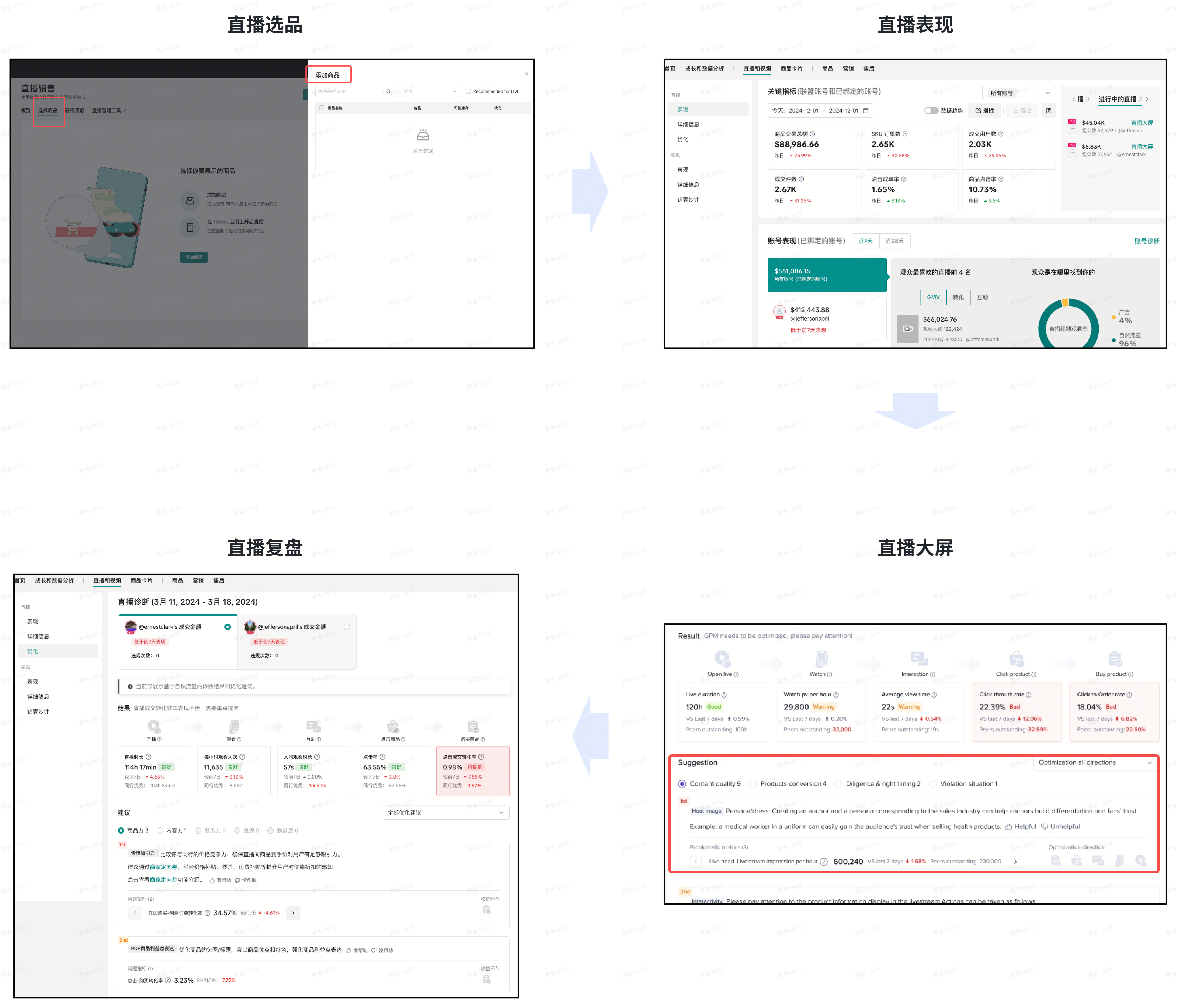 | Step2:直播中盯盘 | 直播实时大屏,监控核心经营指标(曝光/转化/销售金额)以及违规预警,及时调整投流及商品讲解策略 | |