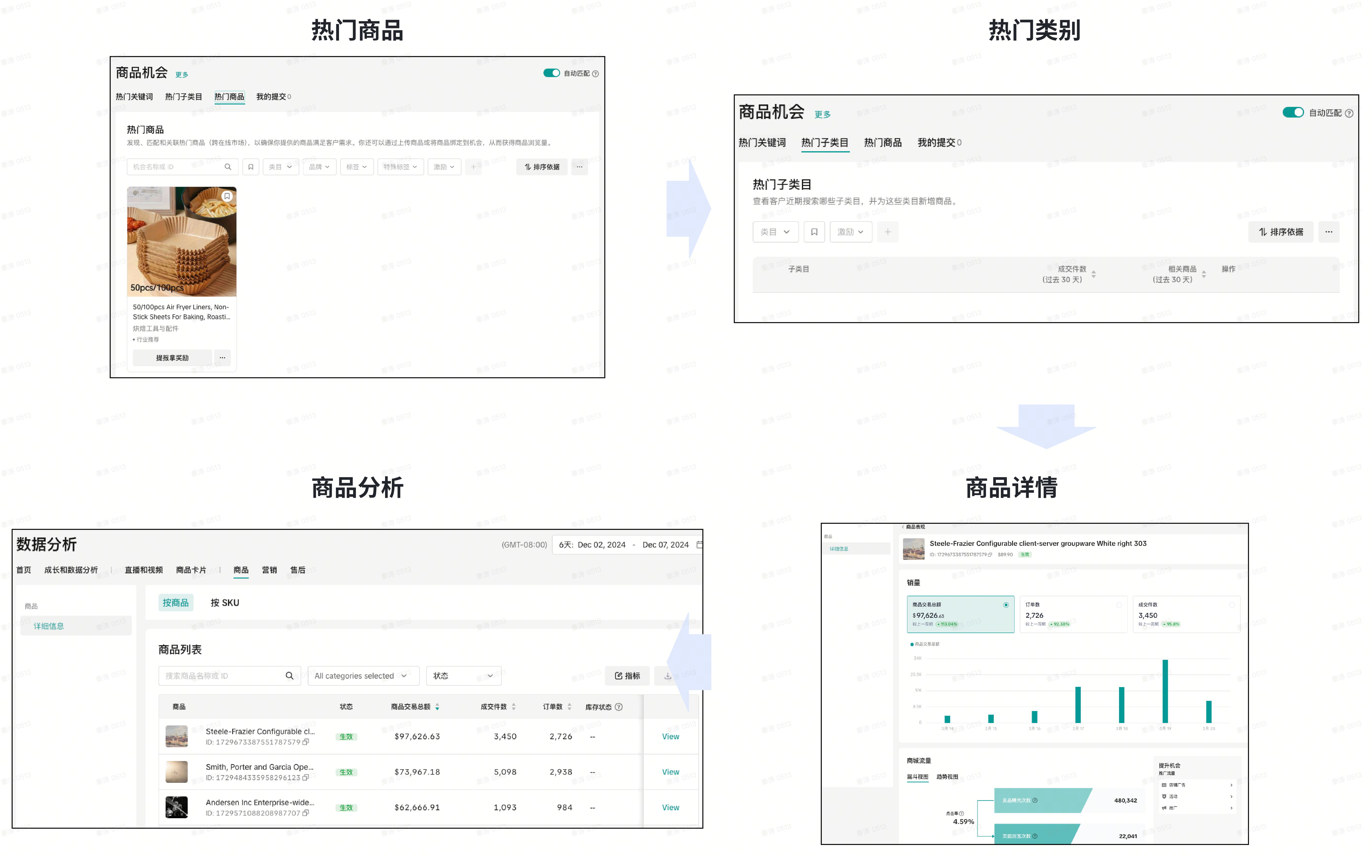| Step1:品类规划 | 提供同类目热门商品榜单,协助选品,对热门类目和热门商品进行挖掘,帮助商家精细化复盘品类销售情况,及时调整不同品类销售策略 | ![]() ![]() |