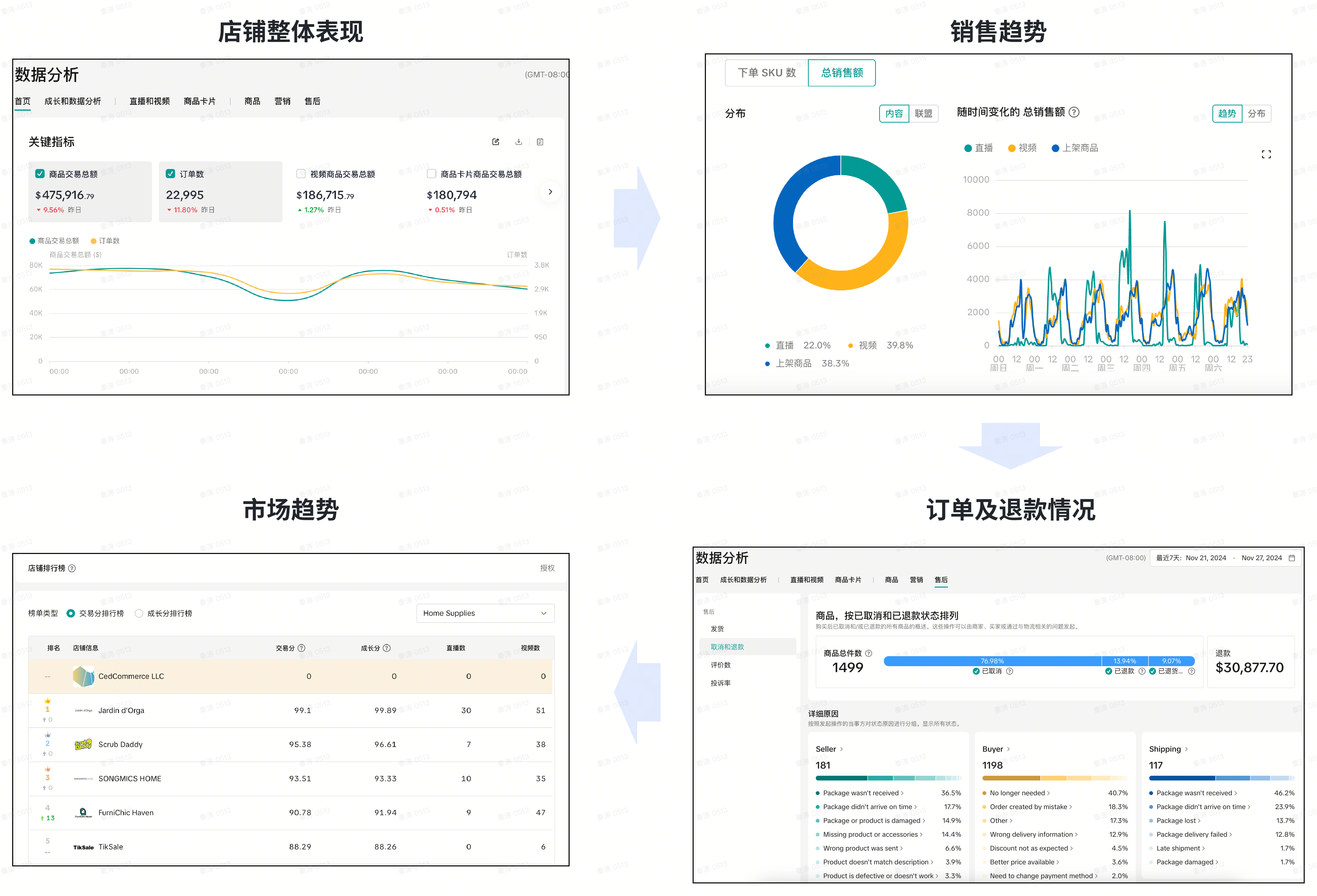 实时监控店铺表现:实时监控GMV、订单、商品、流量等来源变化,掌握店铺交易或直播营销的影响因子,及时调整营销策略;