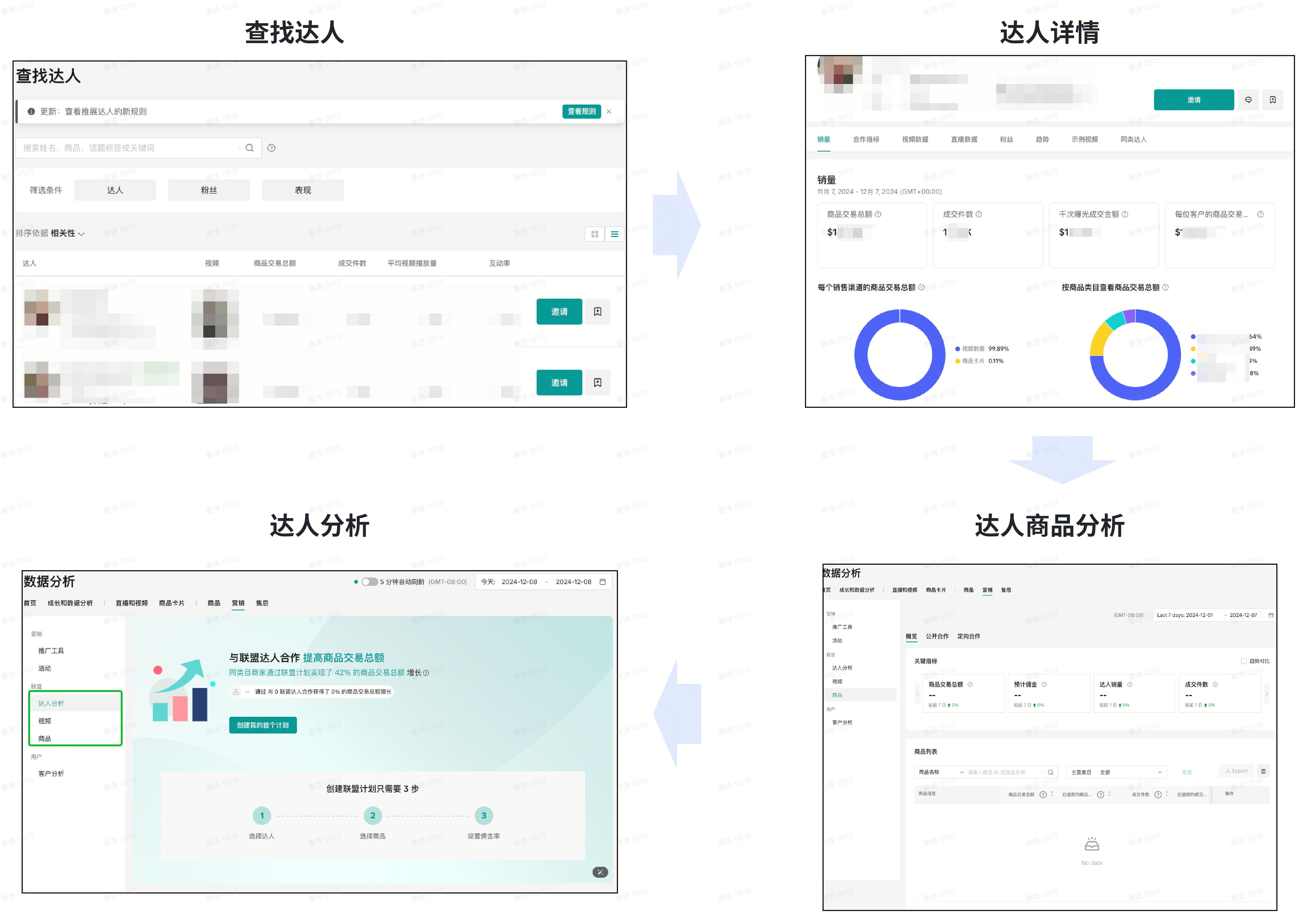 联盟达人合作效果:追踪联盟达人的带货表现,挖掘店铺商品与与达人匹配度,优化联盟合作策略等。