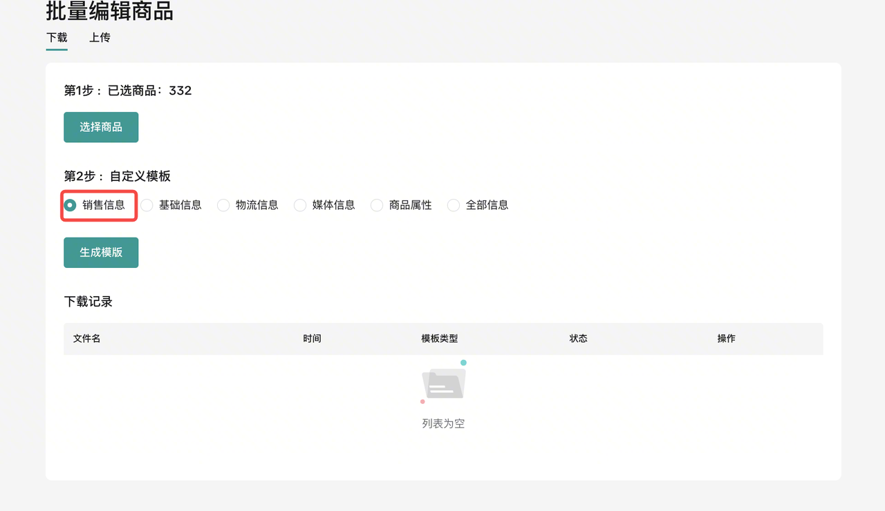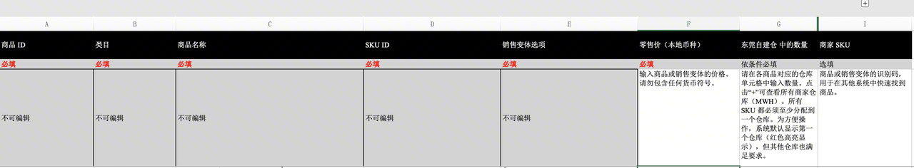 *注意:销售信息的批量编辑模板不会直接显示含税价格,您需要手动编辑。如果不确定含税价格,可参考上文步骤a中“基于税前价定价”组件提供的零售价建议。请注意,系统建议的零售价不包含跨境物流运费等其他成本。建议您在调整价格时,综合考虑产品成本、利润、国内运费等因素。