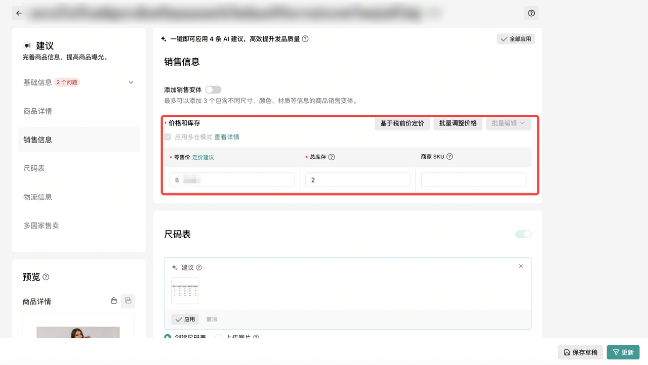 步骤 2:进入商品信息编辑页面。在“销售信息”部分,进行价格编辑。