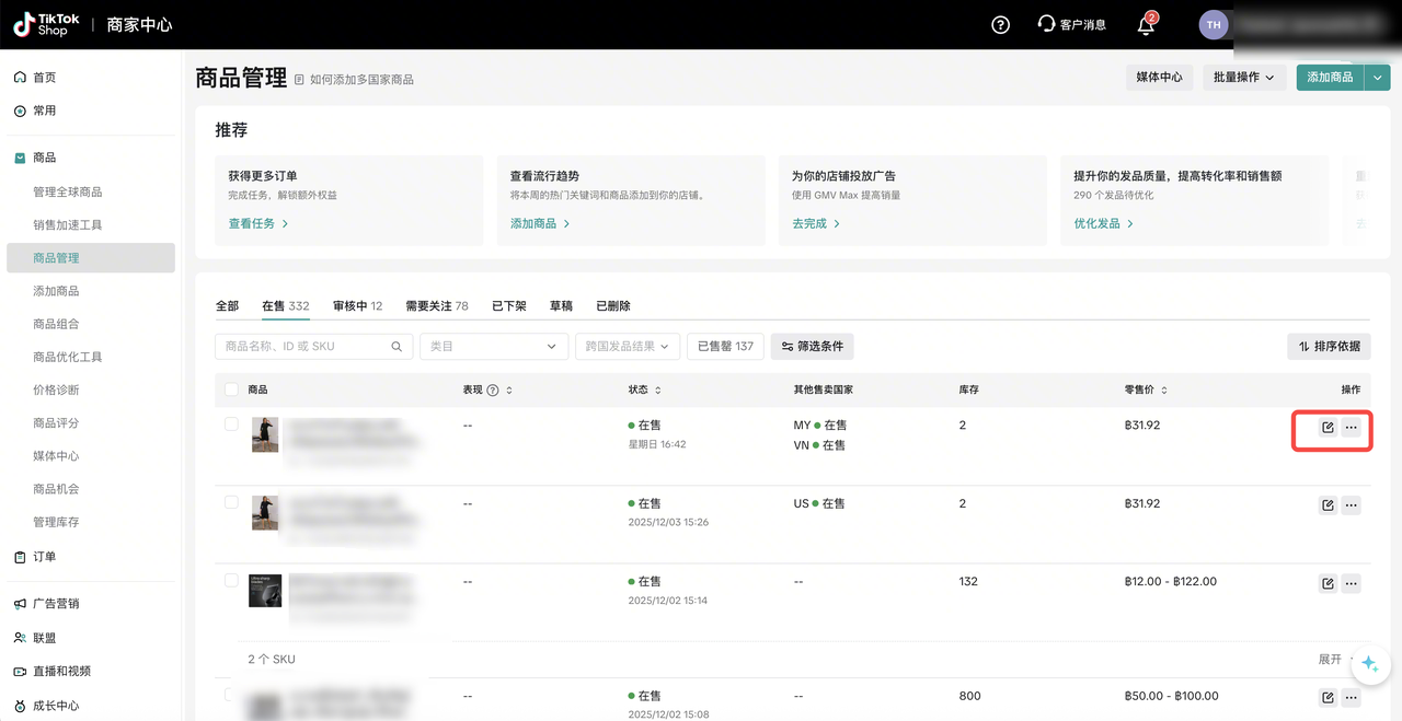 对于目前在泰国站点上架销售的跨境商品,建议卖家考虑此次关税调整,并相应调整存量跨境商品的价格。在售商品的操作流程如下所示。