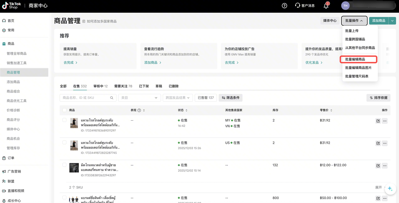 步骤 1:在您的泰国店铺,进入商品管理页面,点击“操作”按钮。