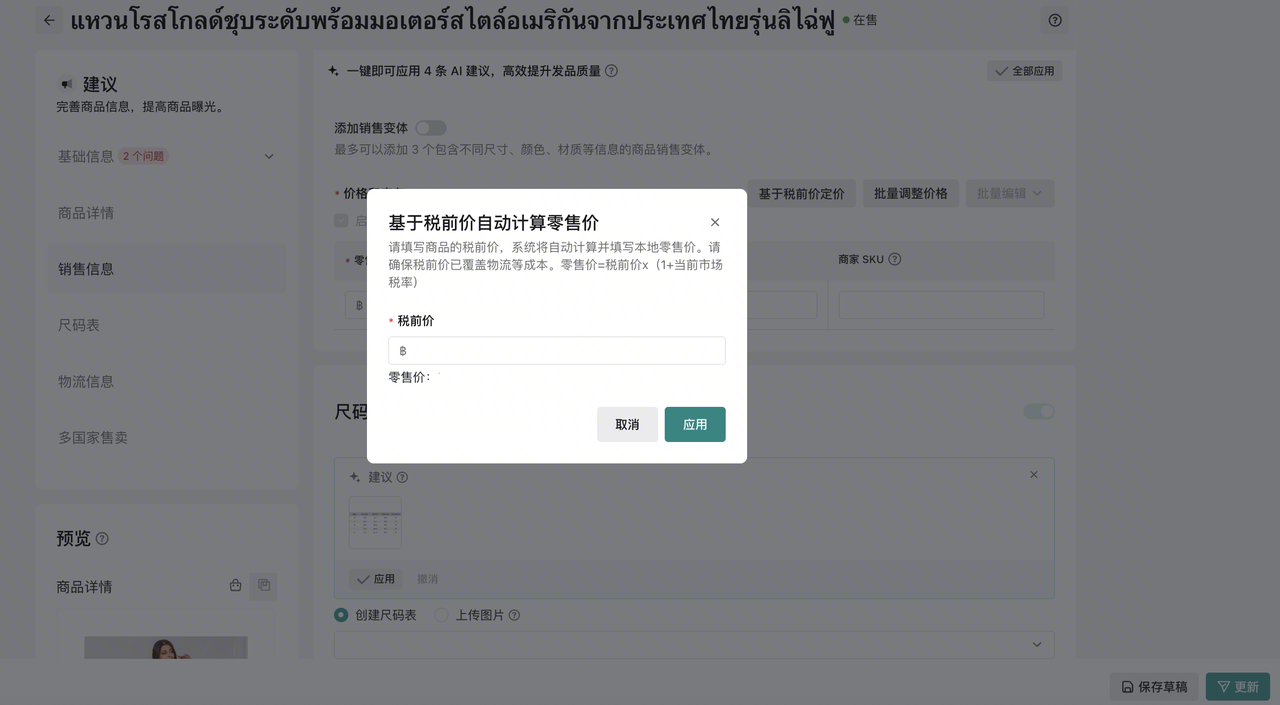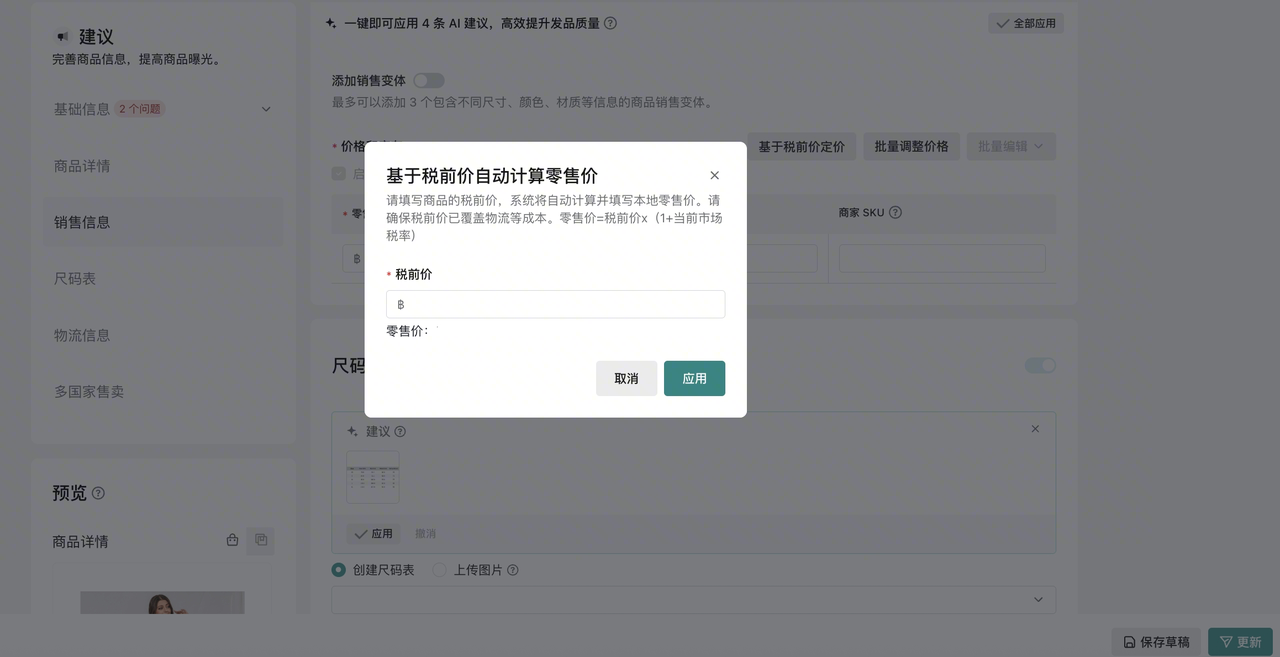 步骤 3:核对销售详情中的价格信息。点击“基于税前价定价”。系统将根据当前市场税率,并考虑平台补贴,为您计算含税零售价。