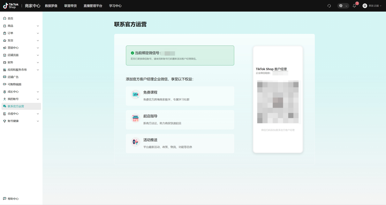 - 若扫码后,页面显示“当前绑定的微信号为:xxx”,则意味着您已经完成了和TikTok Shop官方运营经理企业微信账号的建联。若您已更换微信账号,请使用新账号扫码,并重新添加微信经理。
