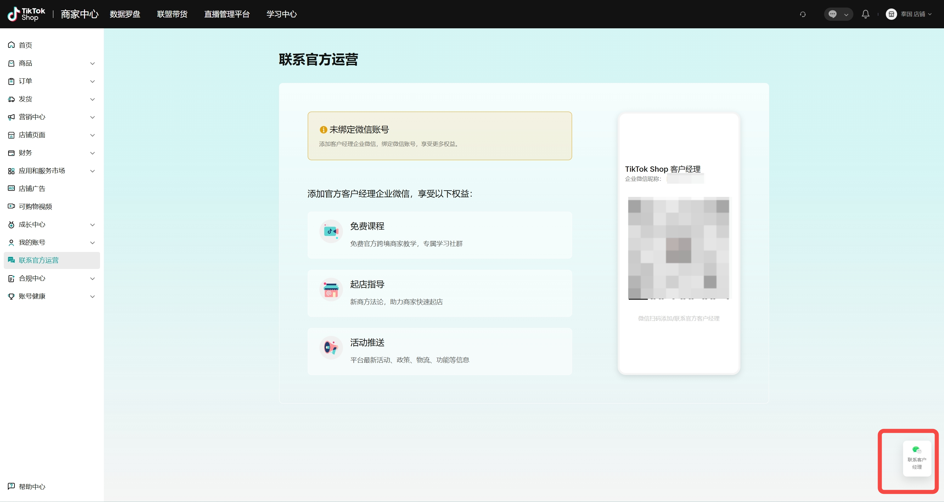 为了更好的服务TikTok Shop东南亚跨境商家,平台针对入驻商家提供专属对接服务。当您成功入驻东南亚跨境店铺后,可以在商家中心>联系官方运营处查看客户经理企微并进行添加。