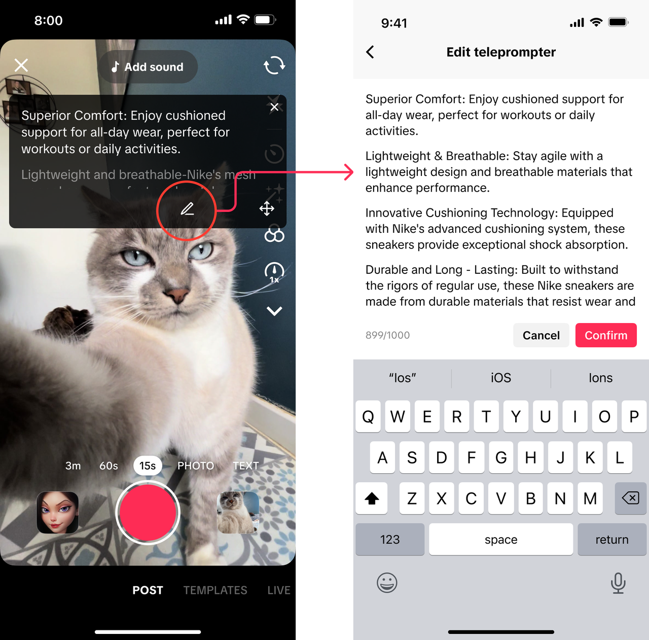 高效的内置提词器:由AI驱动的提词器可将关联产品的关键卖点直接显示在拍摄屏幕上,创作者无需背诵脚本或使用外部提示工具,降低拍摄难度。