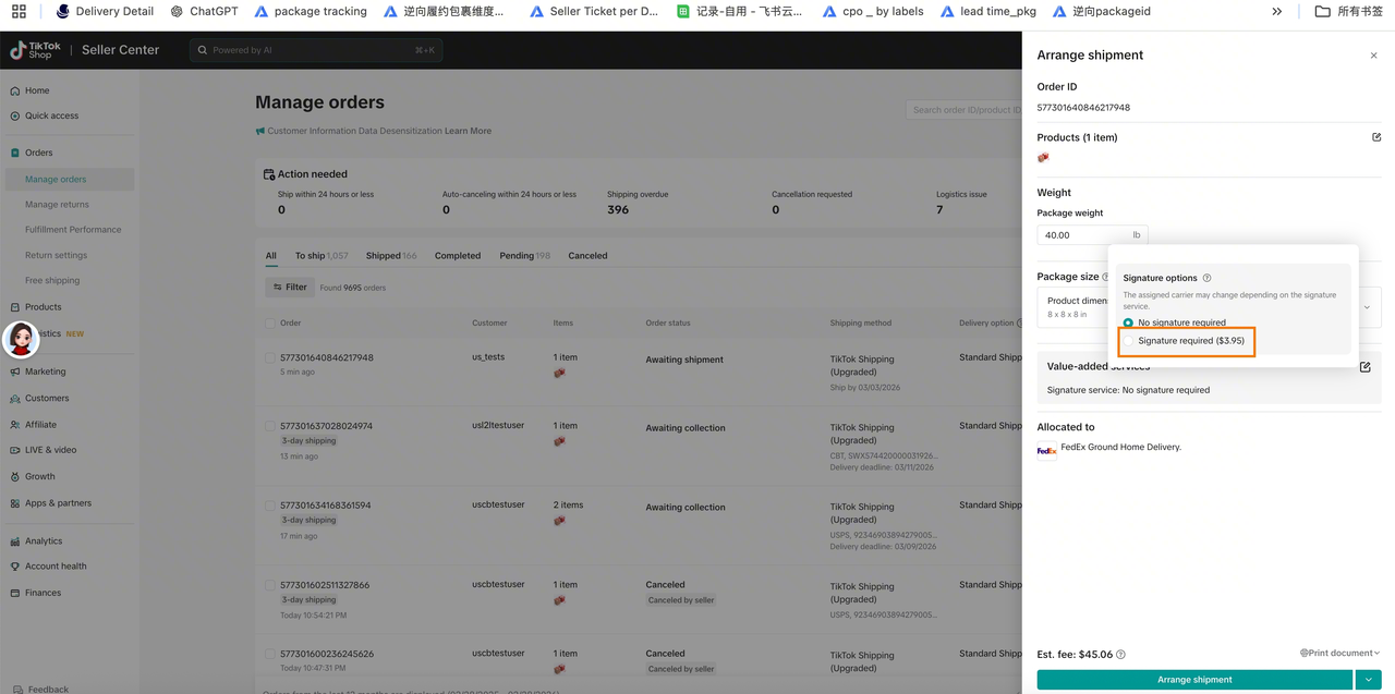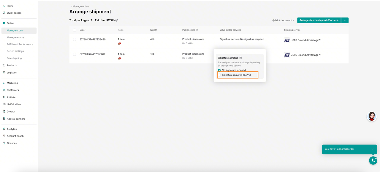 在订单管理页面选择多笔订单,批量申请物流面单。在安排发货页面,点击增值服务,勾选 “需要签名”,即可为选中的包裹开通该服务。