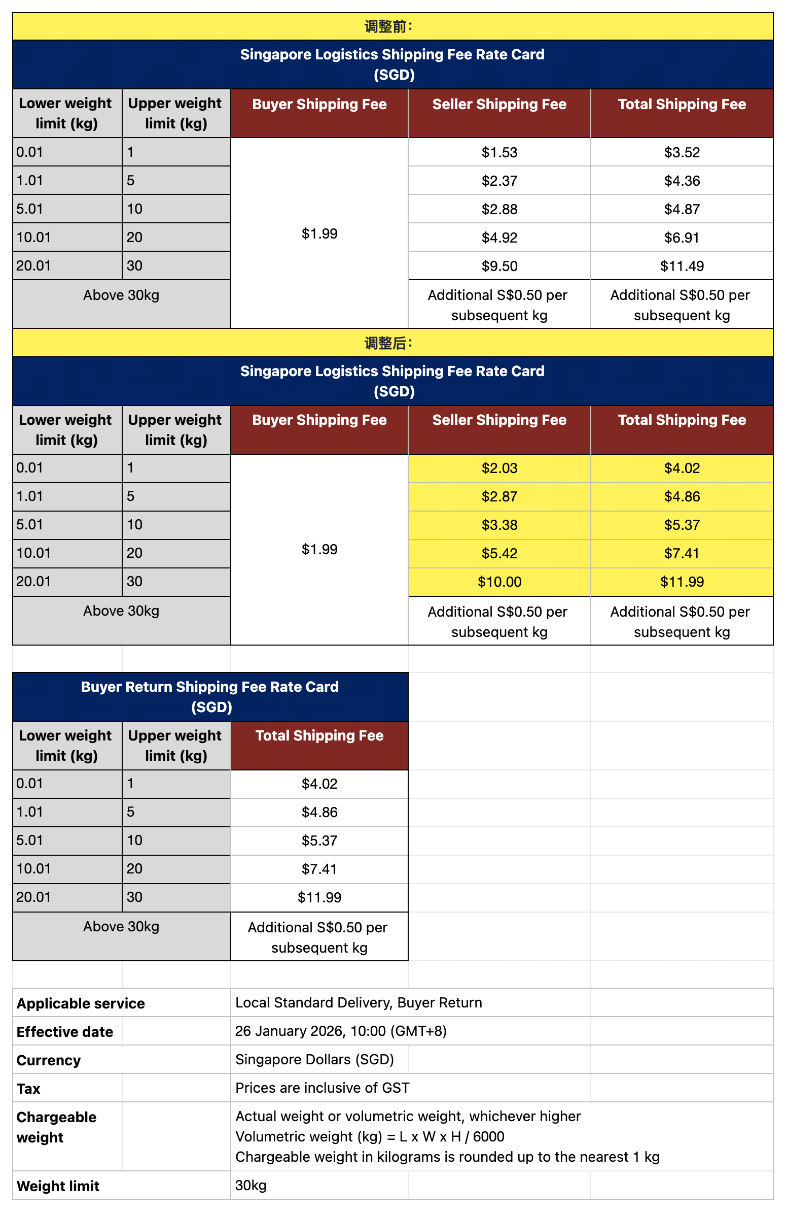 TikTok Shop 将从1月26日上午10:00 (北京时间,GMT+8)起调整新加坡海外仓价卡,具体调整如下