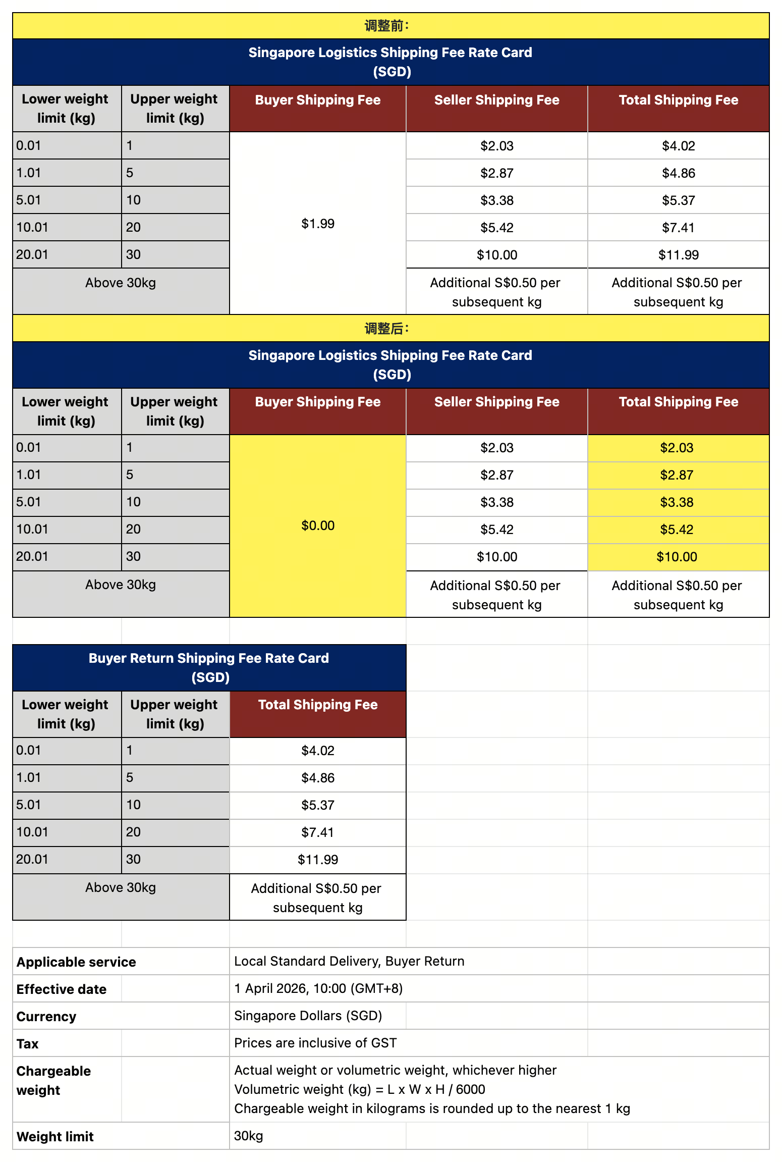 TikTok Shop 将从4月1日上午11:00(北京时间,GMT+8)起调整新加坡海外仓价卡,具体调整如下