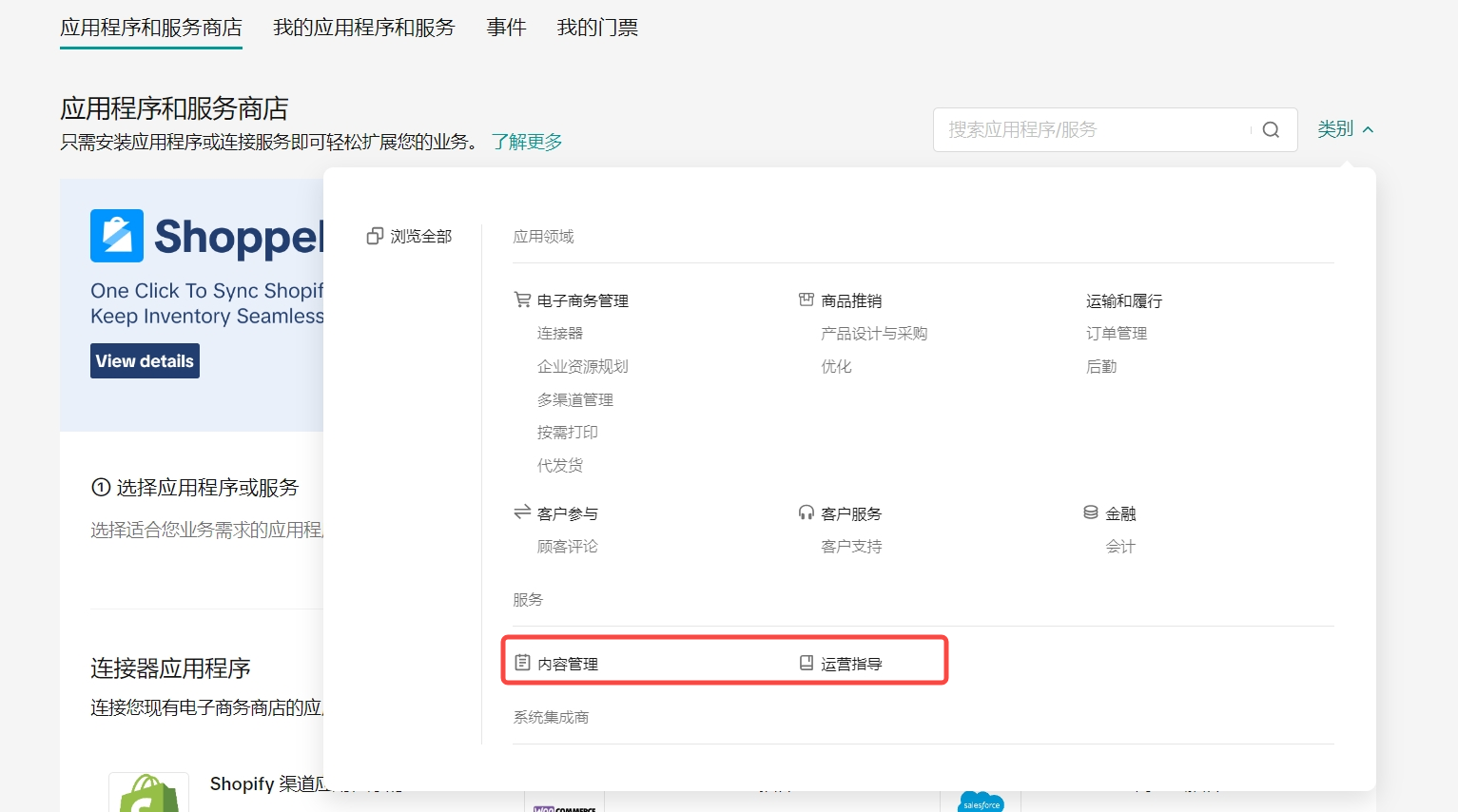 前往卖家中心->服务商店,您可以点击类别进行筛选
