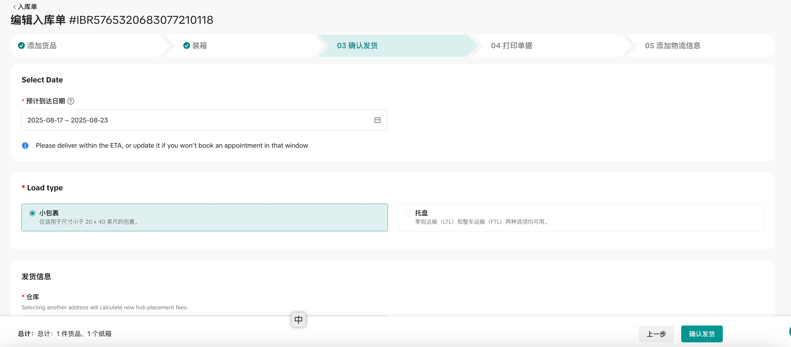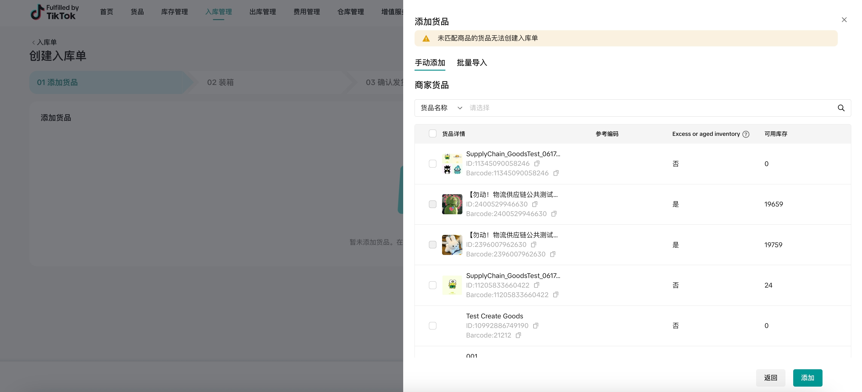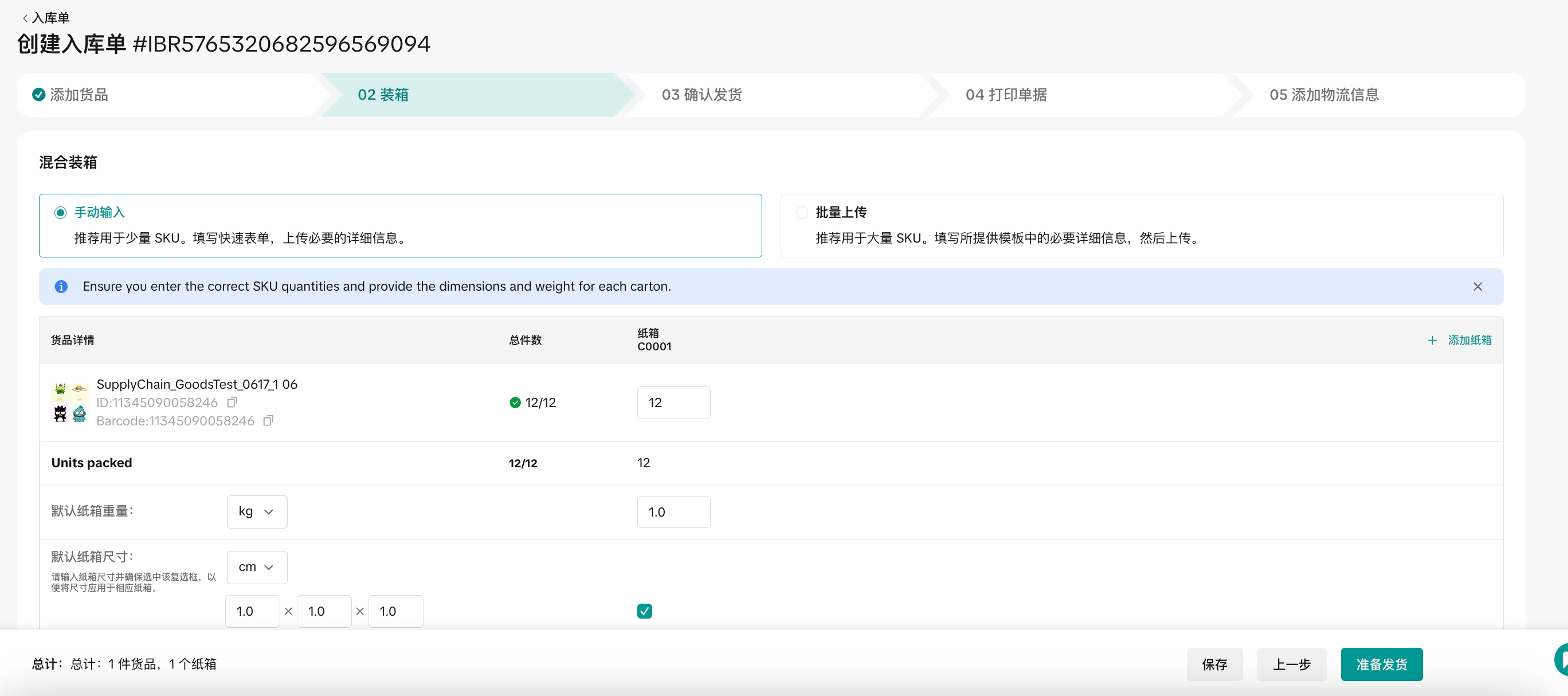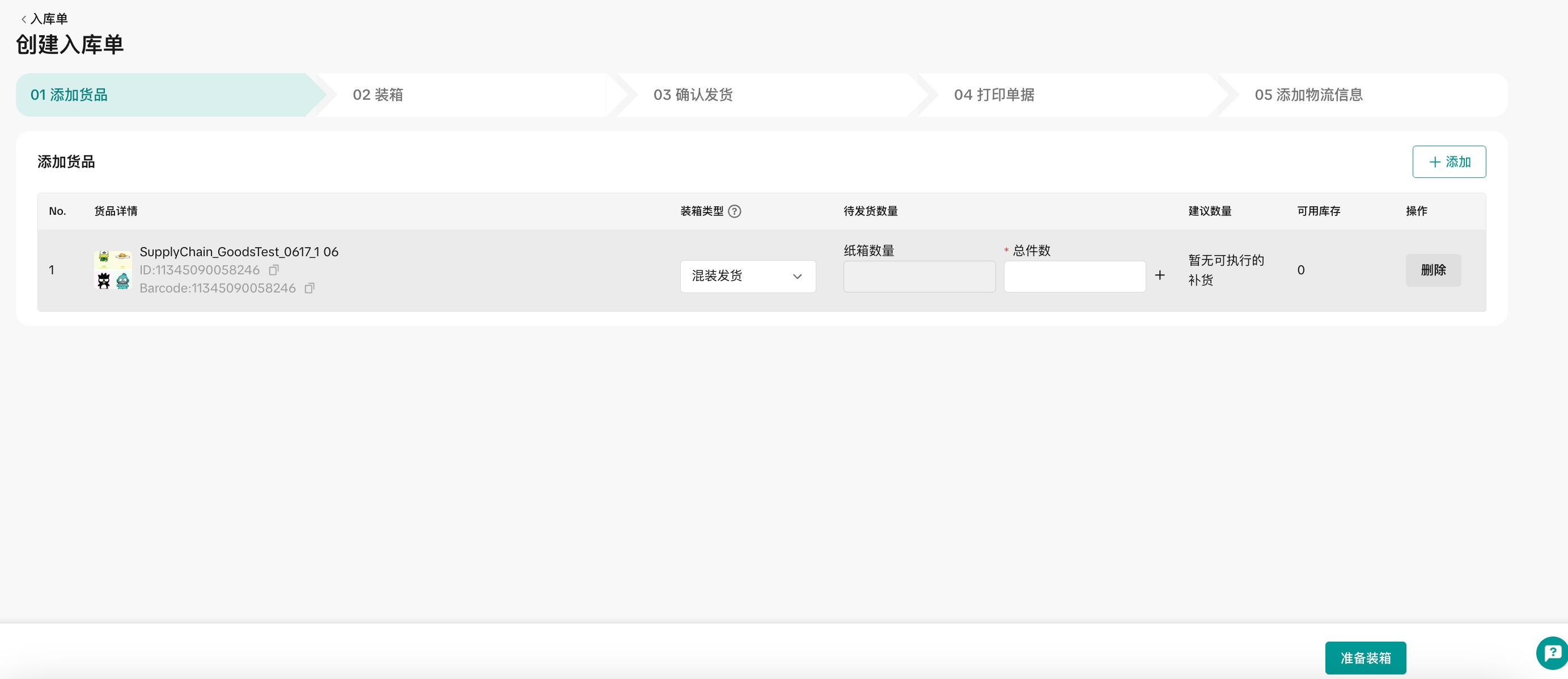 - 创建入库单: 货主平台 > 入库管理 > 备货入库单