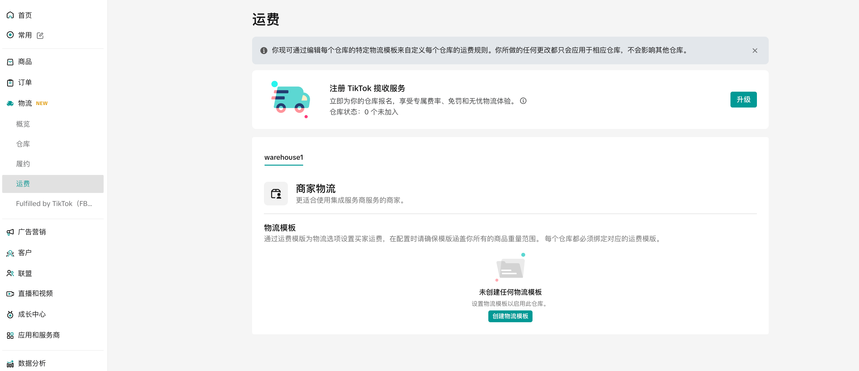 如果仓的物流服务设置为“卖家发货”,需要在上传商品前完成运费模板的配置,否则在上传商品时会被拦截。