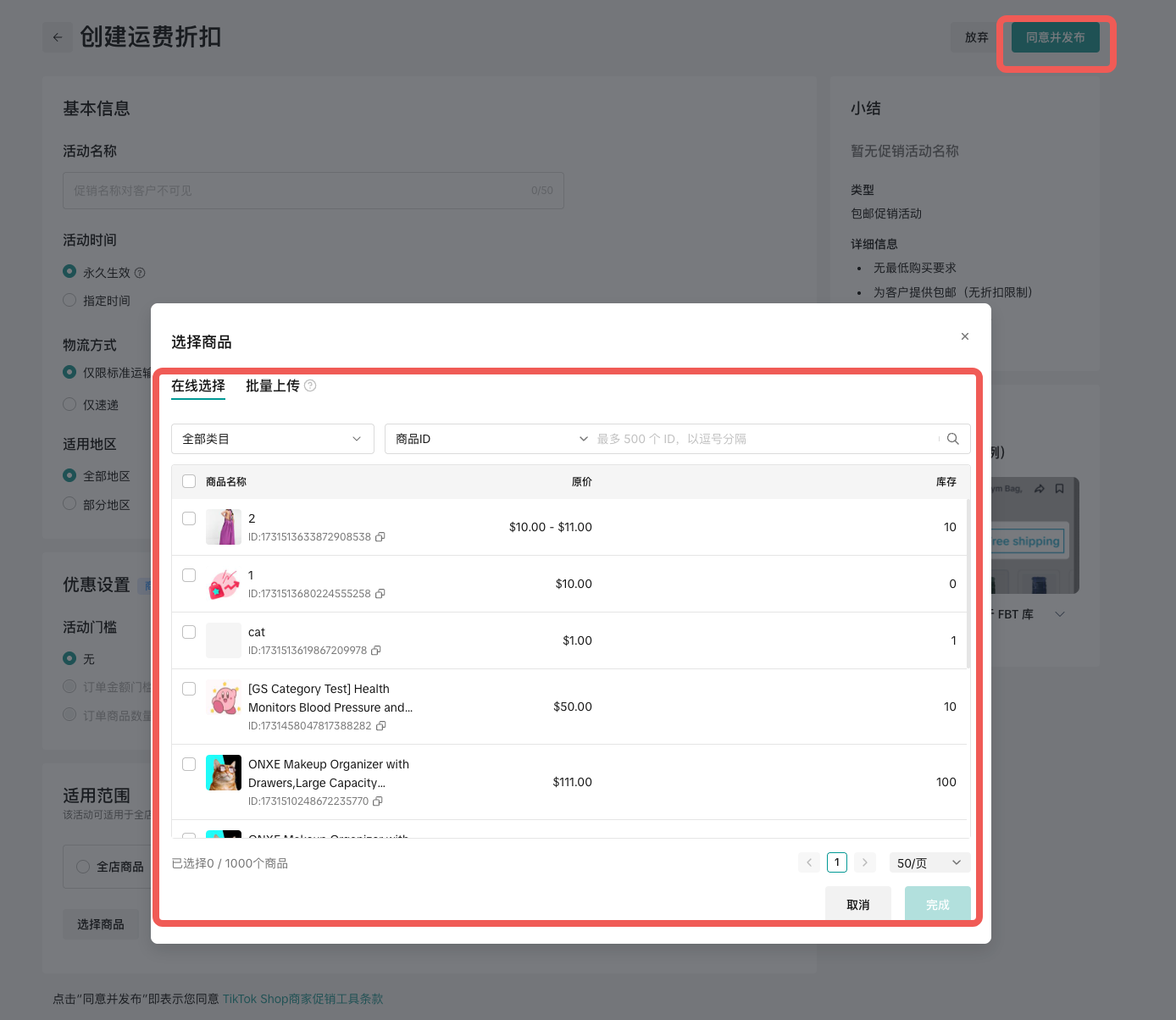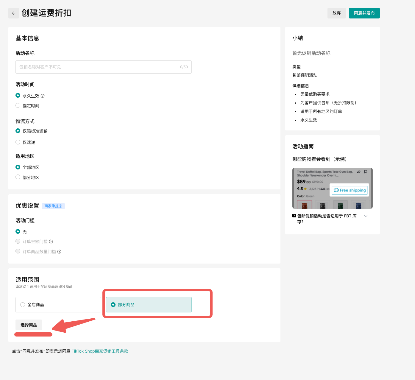 - 填写基本信息(Basic information) > 选择特定商品(specific products)去设置包邮 > 点击同意并发布(Agree & Publish)