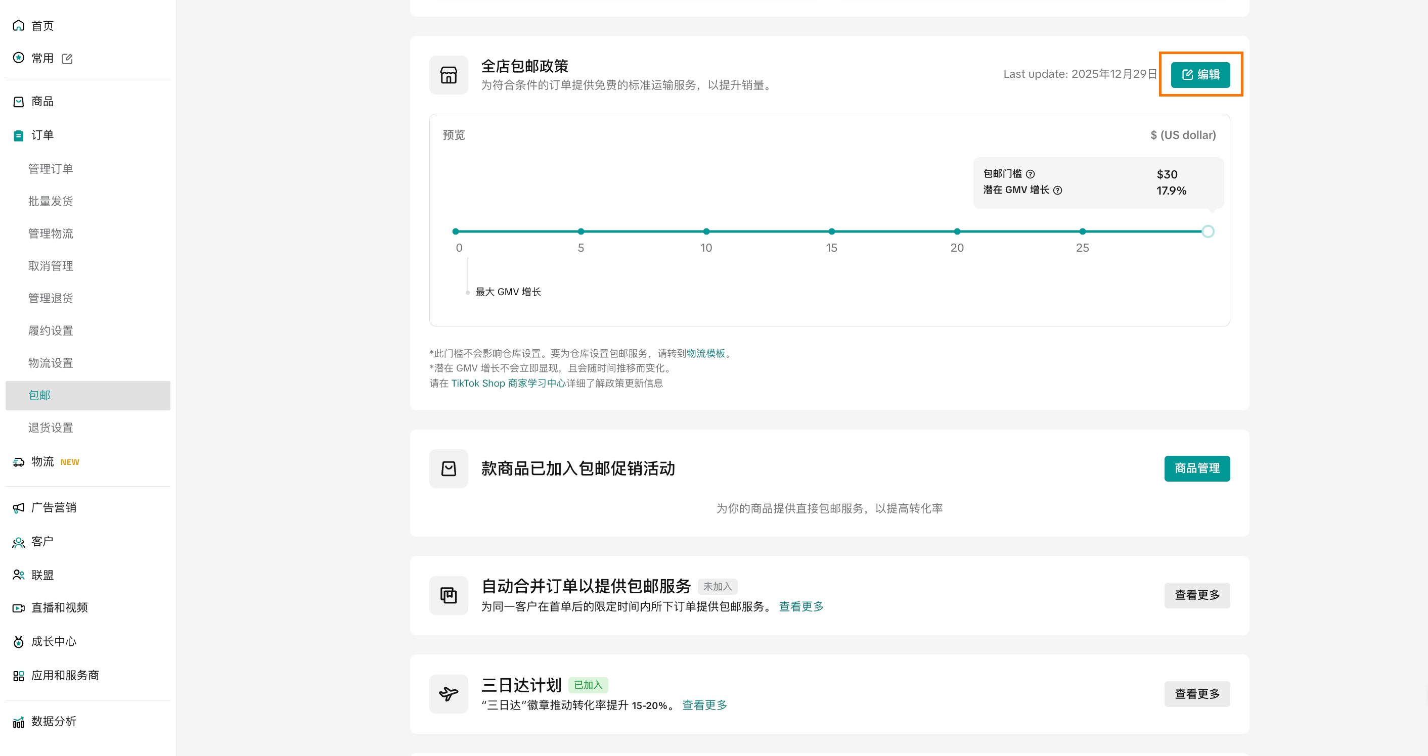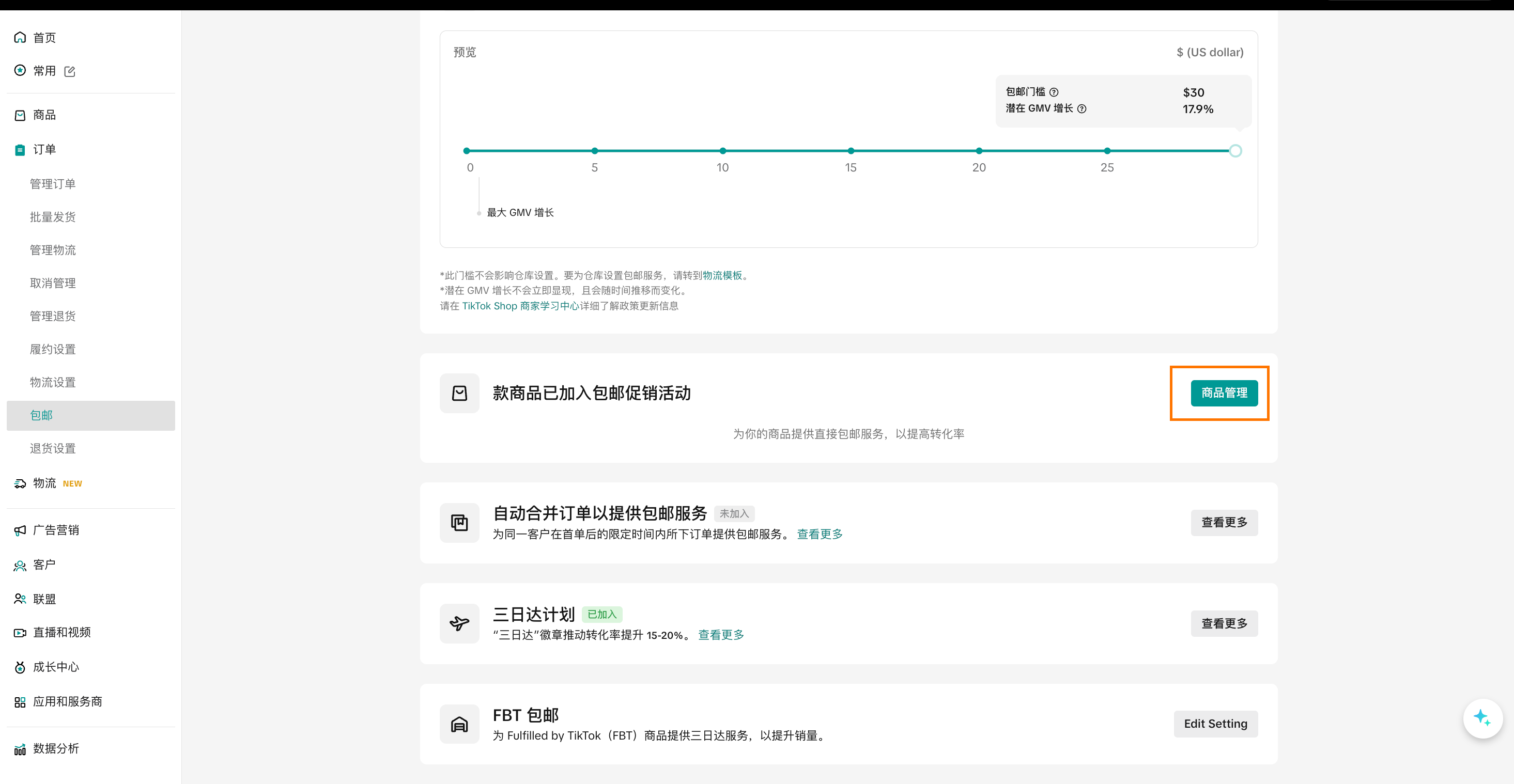 - 菜单路径:首页 > 订单 > 包邮> 概览> 商品已加入包邮促销活动