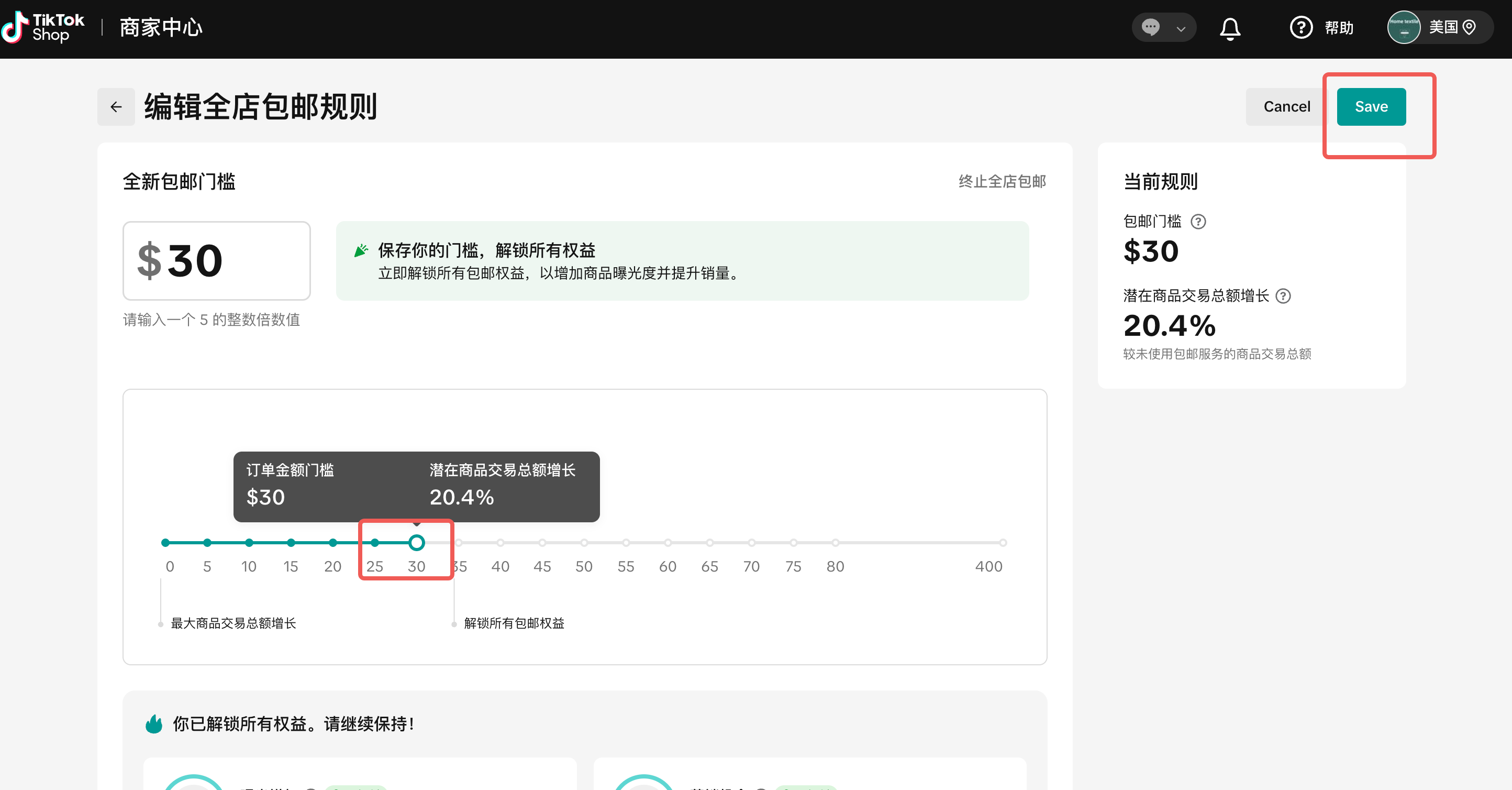 - 移动运费门槛条上的圆圈(circle)来设置门槛金额 > 保存(Save)