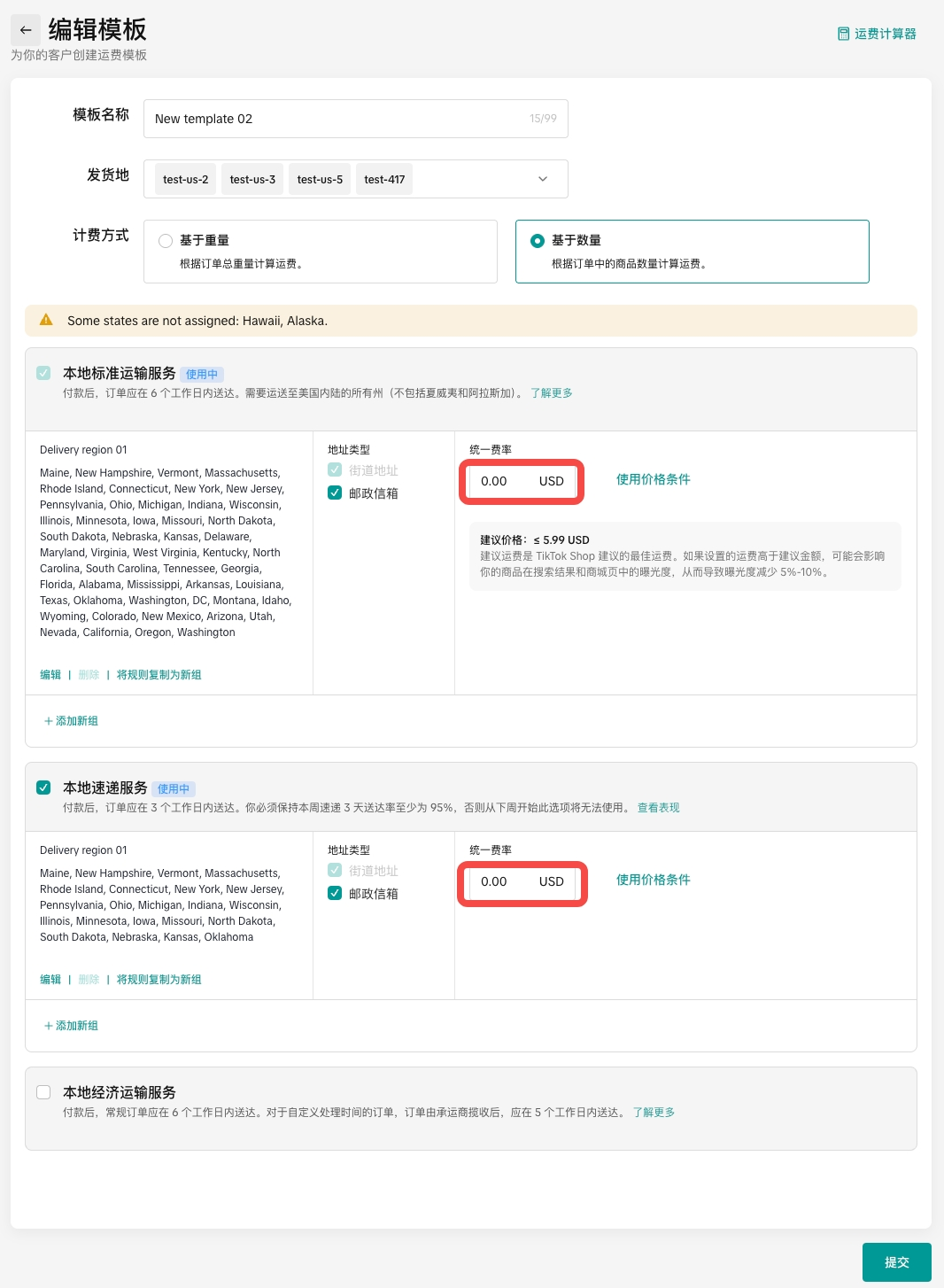 统一费率:设置本地标准运输服务、本地速递服务的费率
