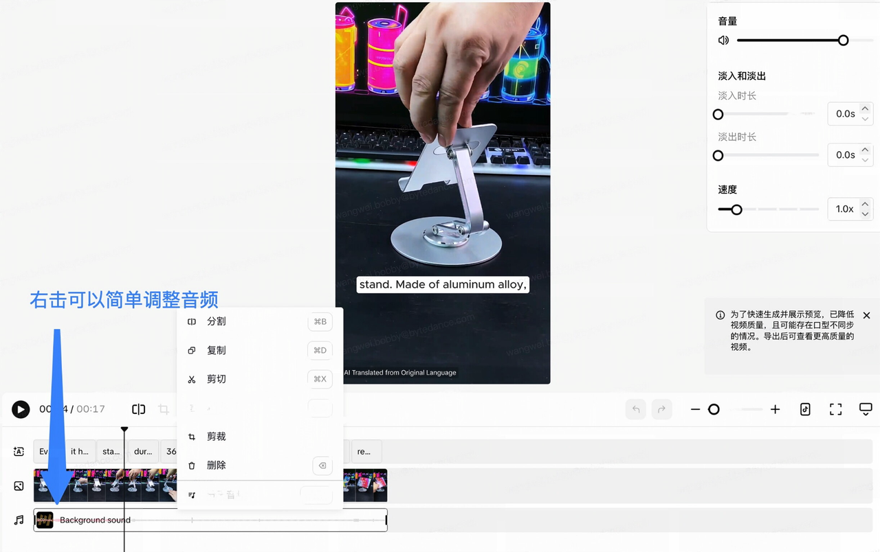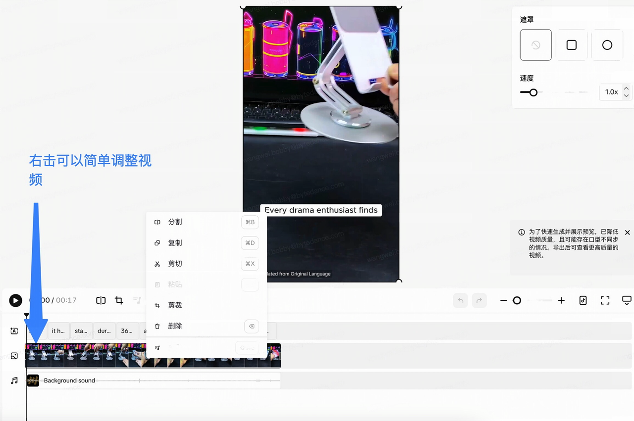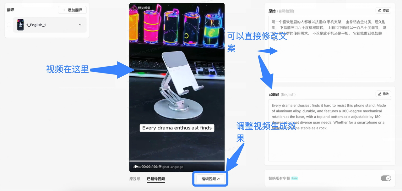 纯商品展示类的短视频一键翻译效果较好,一键生成后无需人工调整