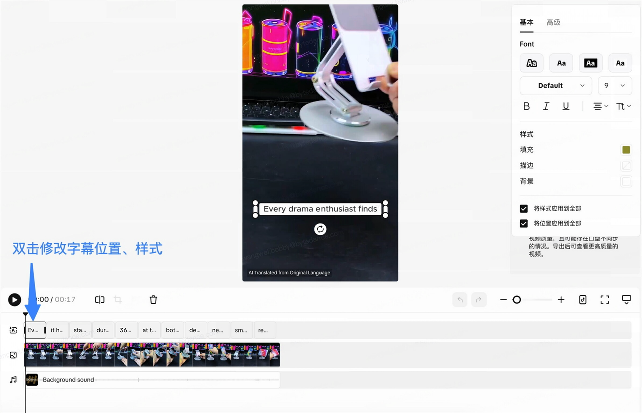 | 若想进一步编辑视频,点击右下角编辑视频,你将可以调整字幕、视频、音频的位置、尺寸等 | | |