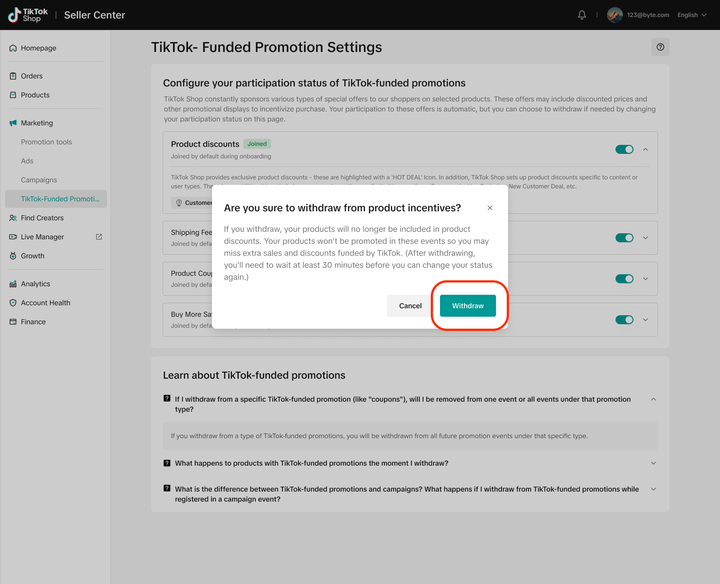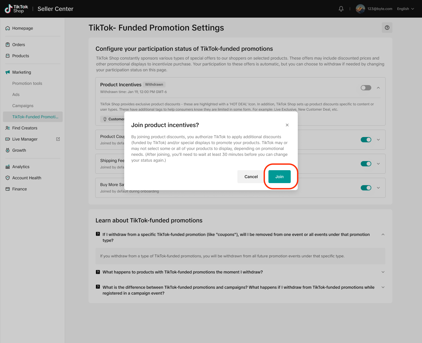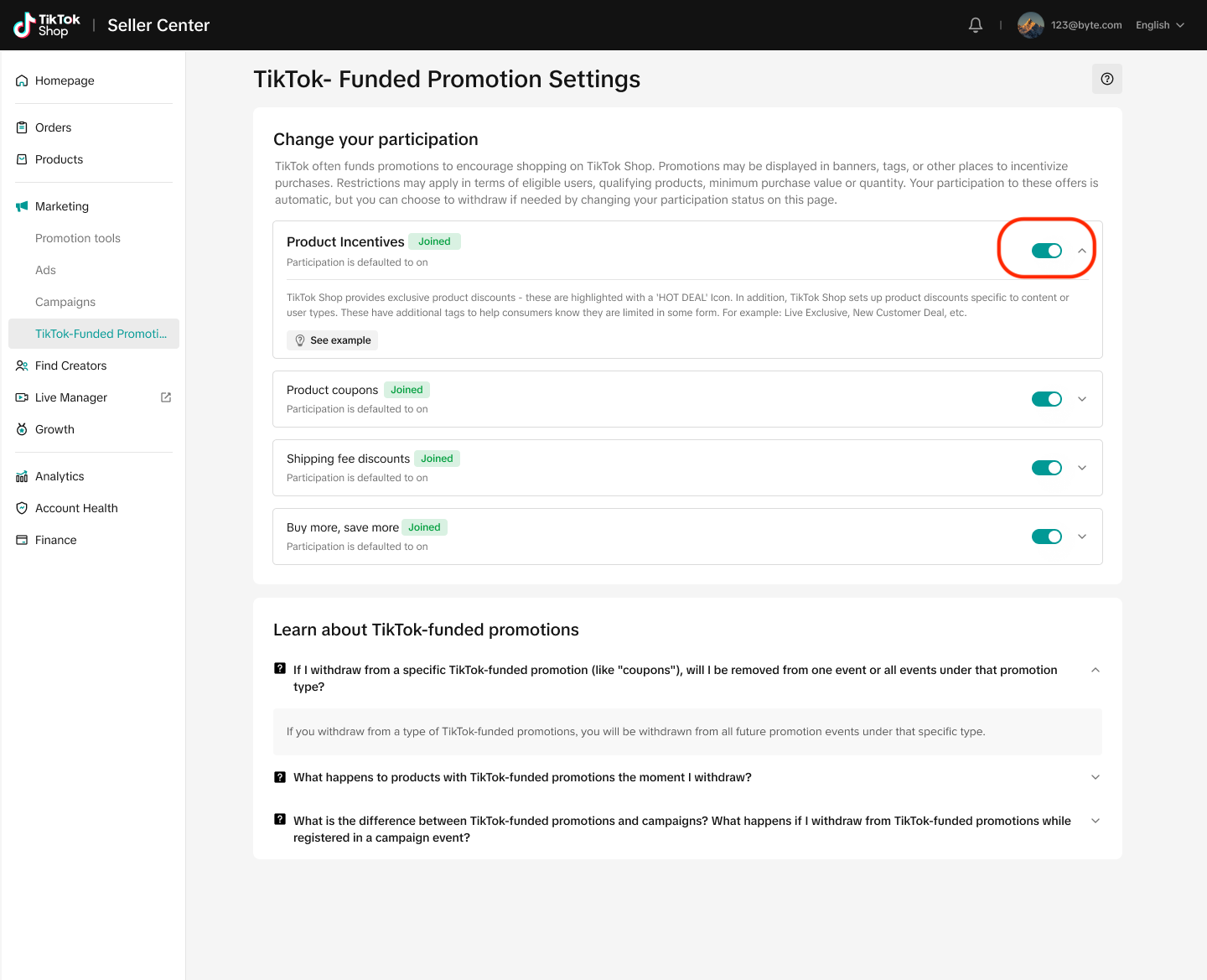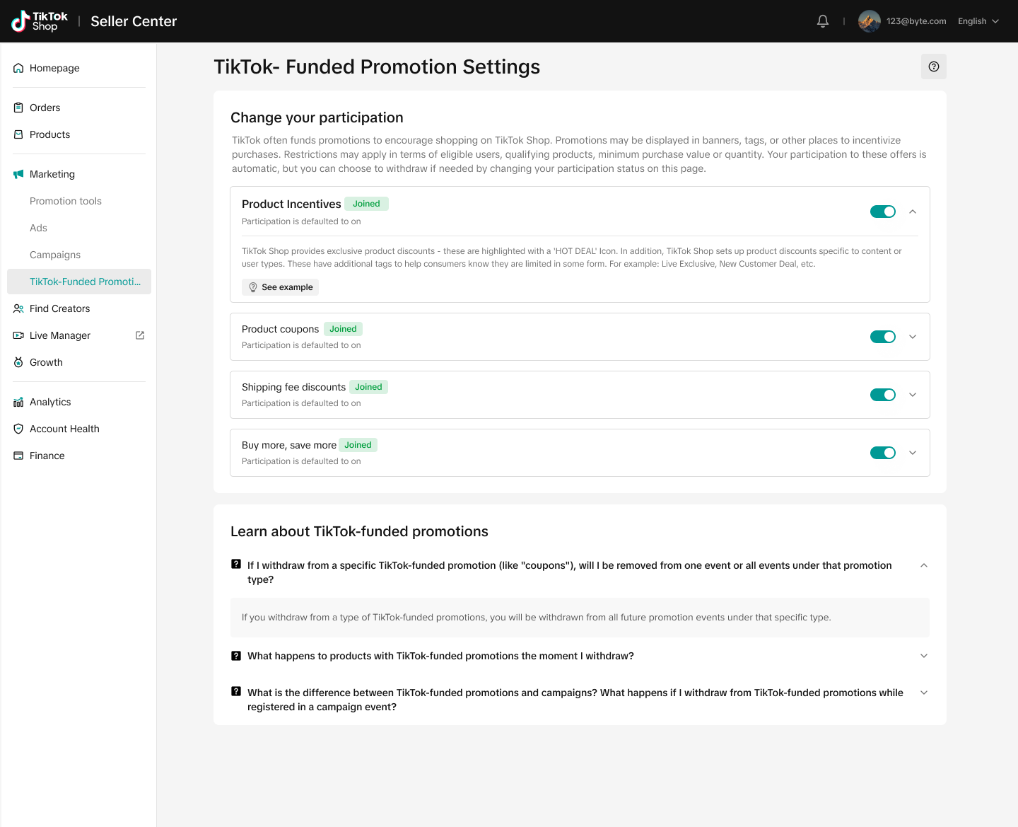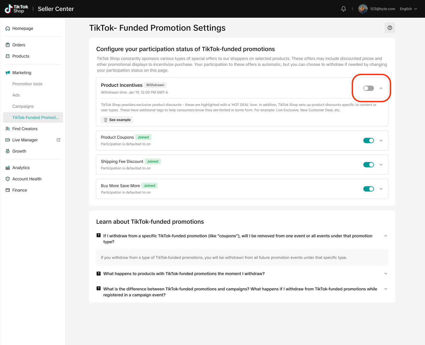 第一步:前往 Seller Center -> Marketing -> TikTok-Funded Promotion Settings 模块