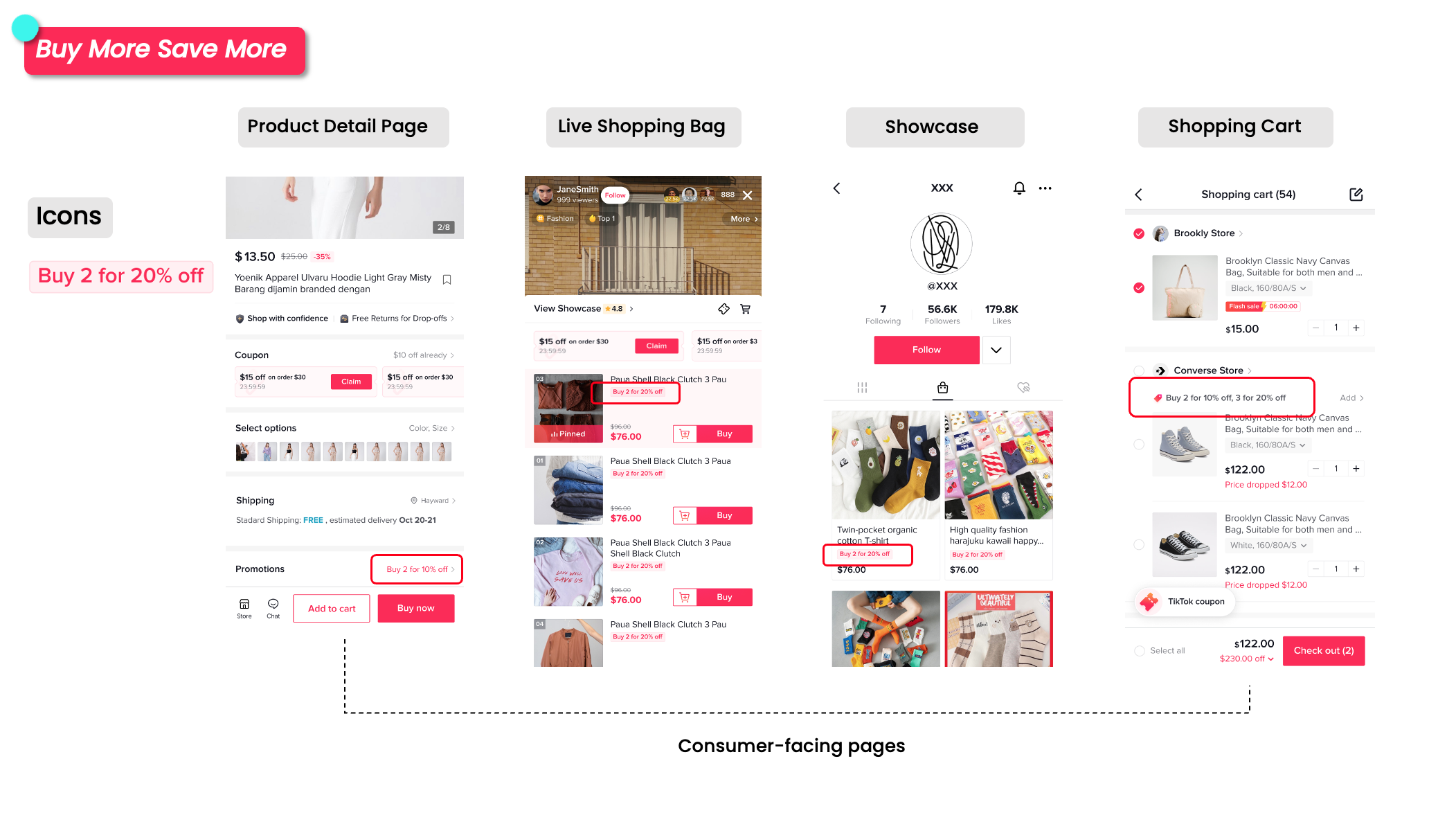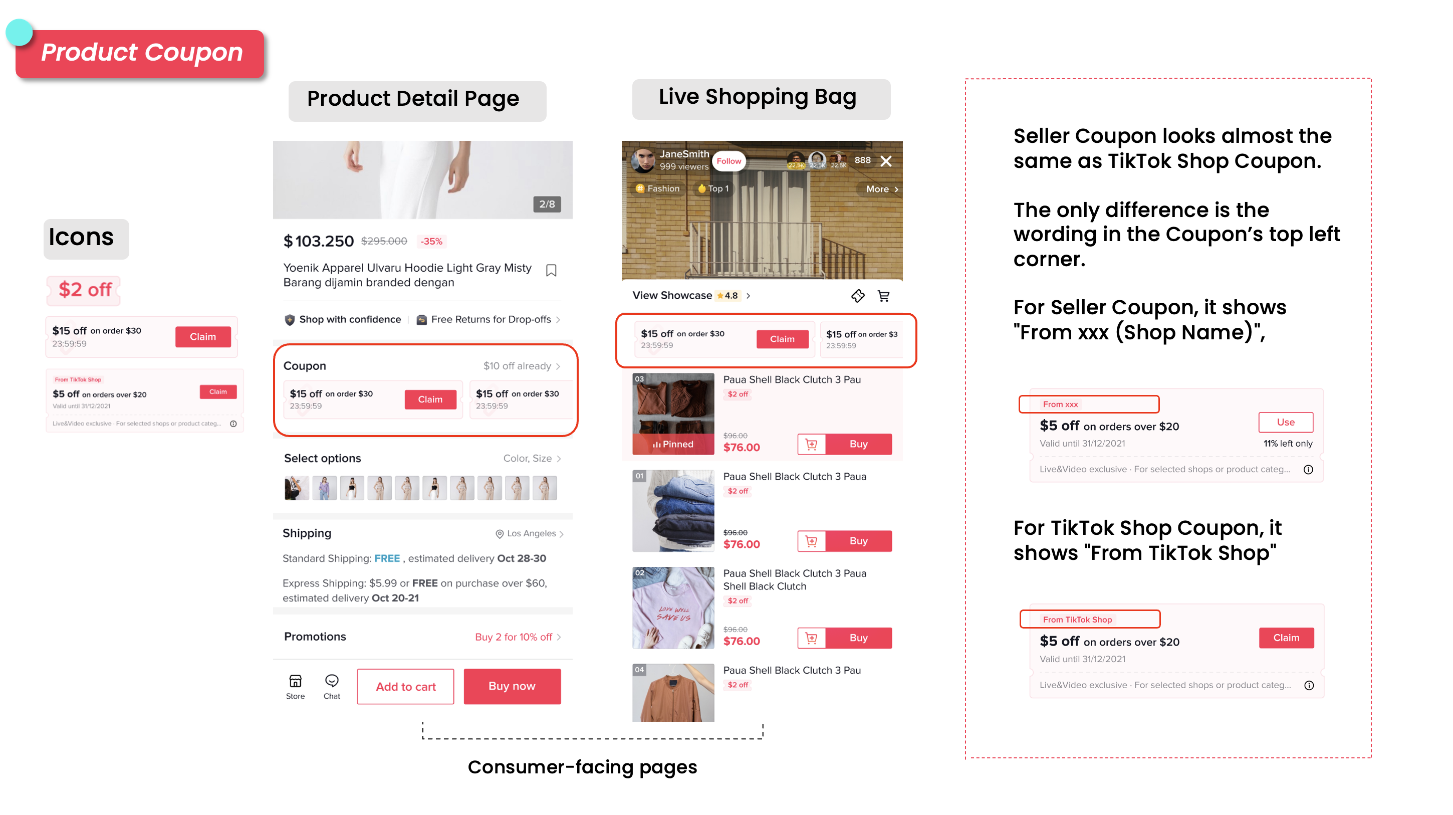 商品优惠券为消费者提供在满足最低购买门槛的情况下享受订单折扣的机会,折扣可以是百分比折扣 (X% off) 或固定金额折扣 ($X off)。消费者可以在使用此优惠券的同时参与卖家的促销活动。