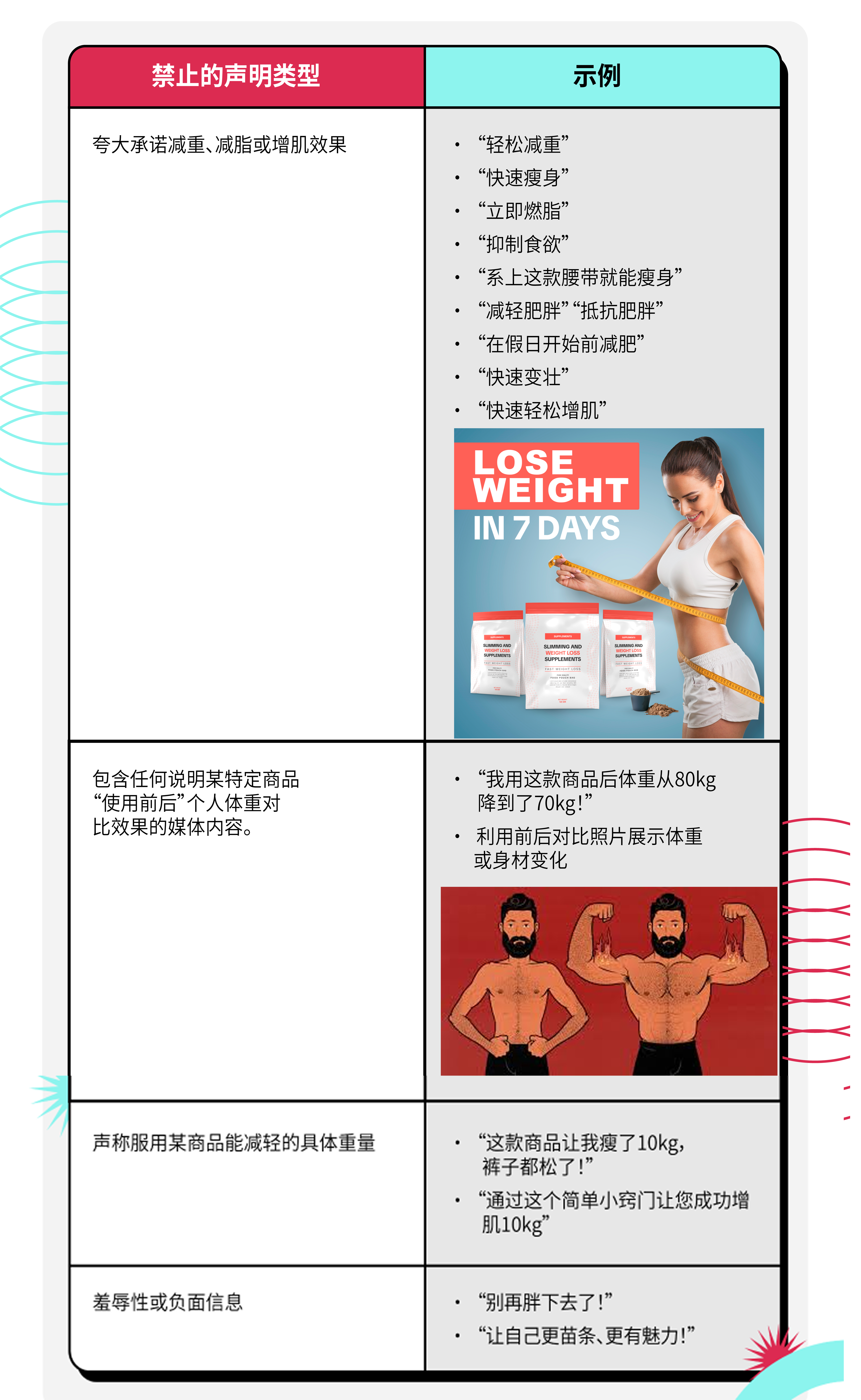 误导性减肥宣传 – 不得做出夸大承诺、展示极端体型变化或使用身材羞辱性表述。
