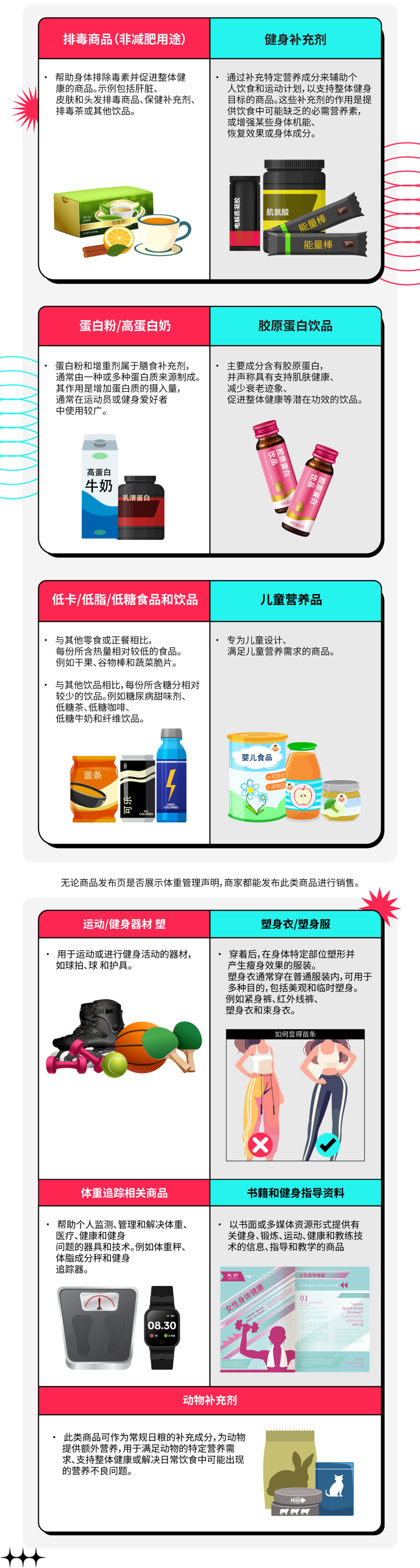 在未作出体重管理宣传的情况下,可以在TikTok Shop销售以下商品。我们建议商家宣传商品的一般保健功效,如宣传改善精力、柔韧性或具有综合保健功效。