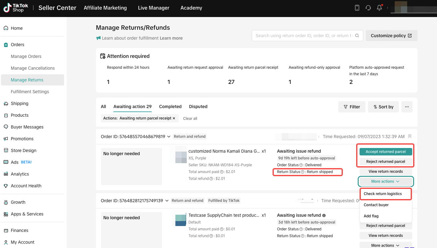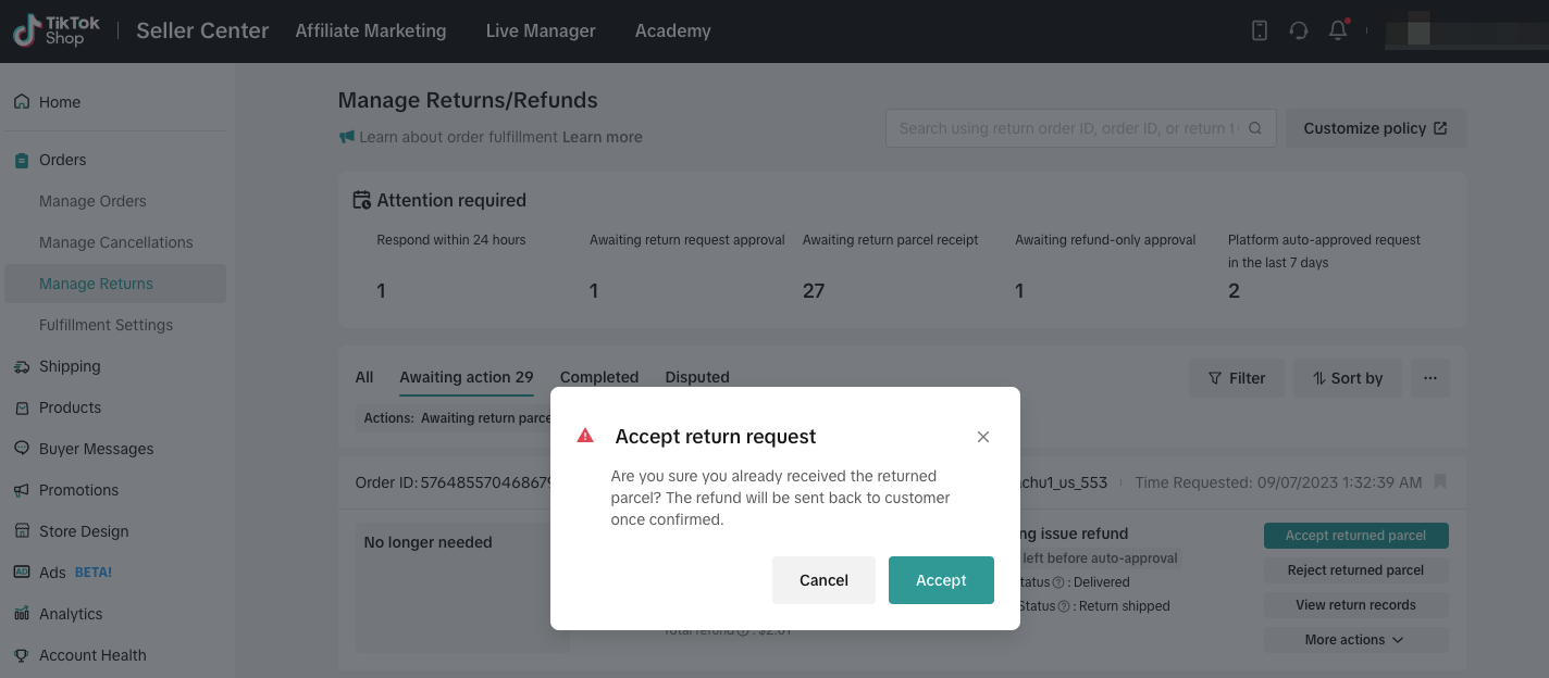 买家寄出商品后,您需要等待包裹送达并验货。此时可选择接受或拒绝退回的包裹。若接受,系统将自动向买家发起退款。若选择拒绝接受退货包裹,您需选择拒收原因并上传相关证明。