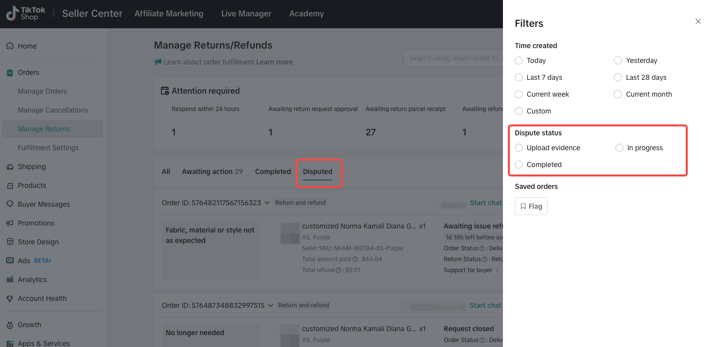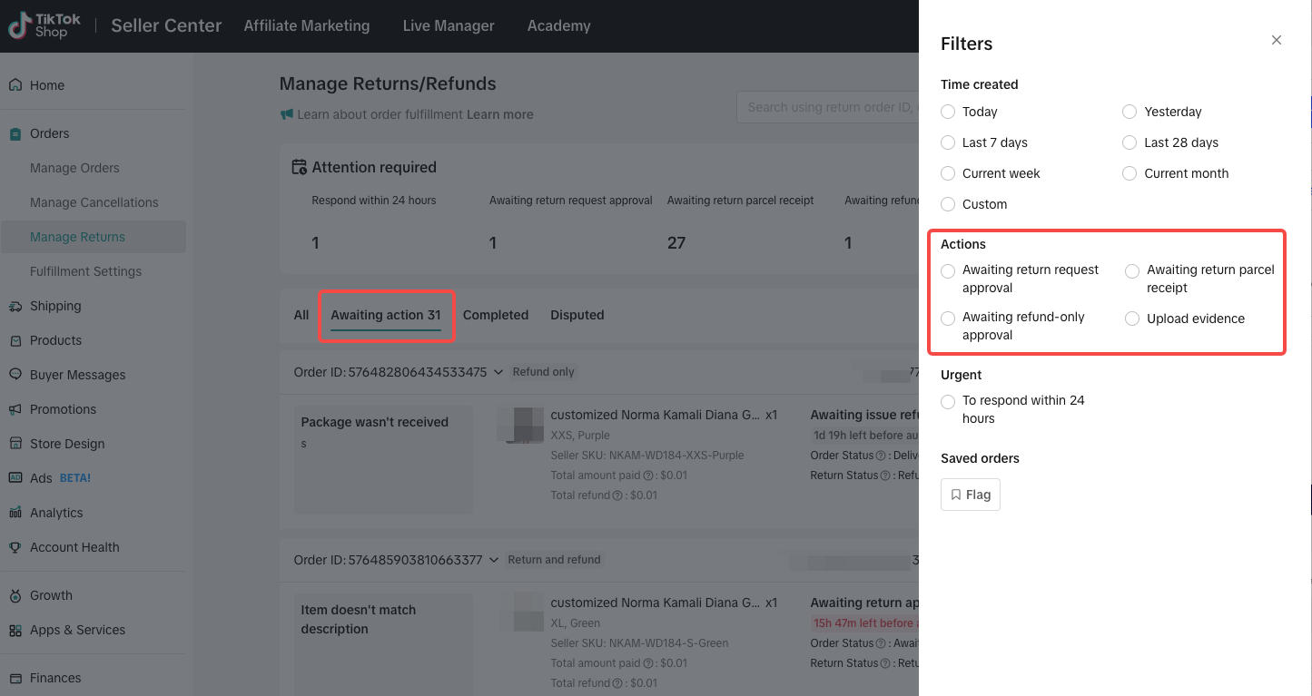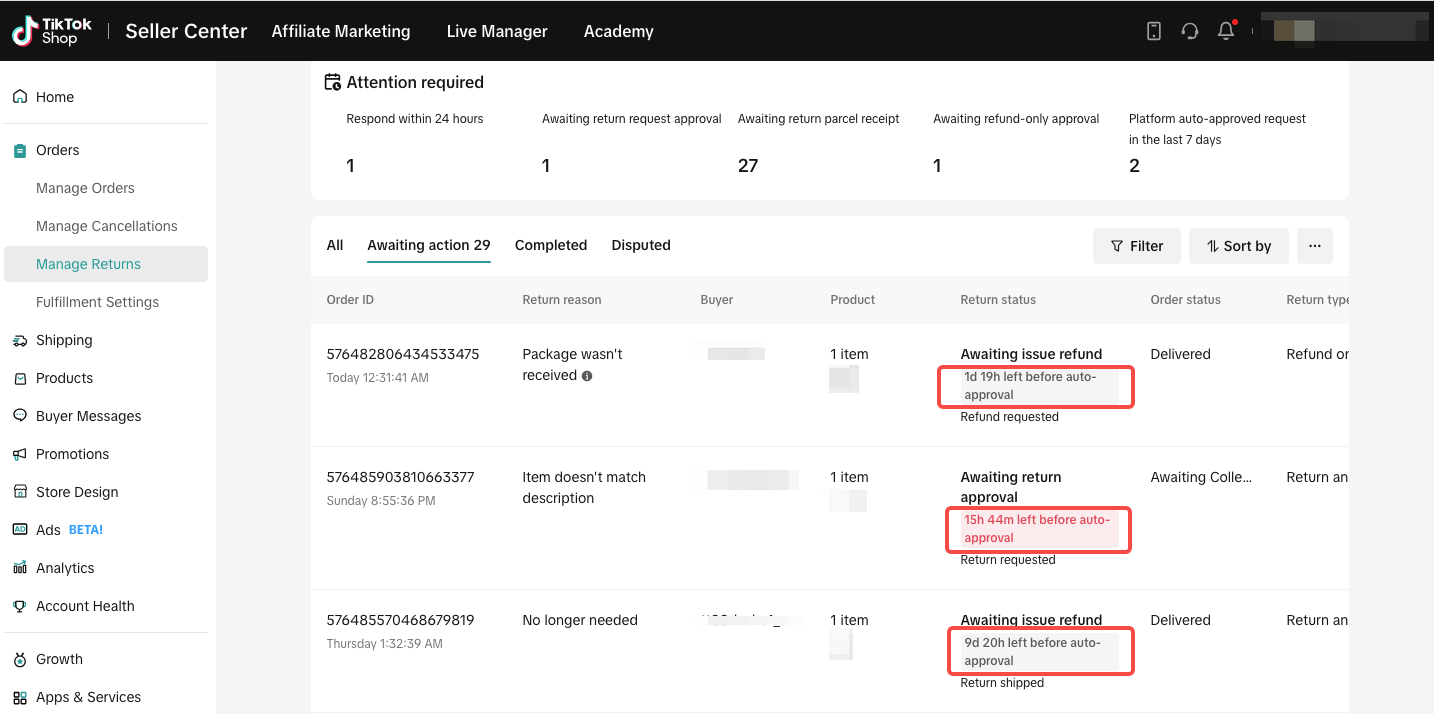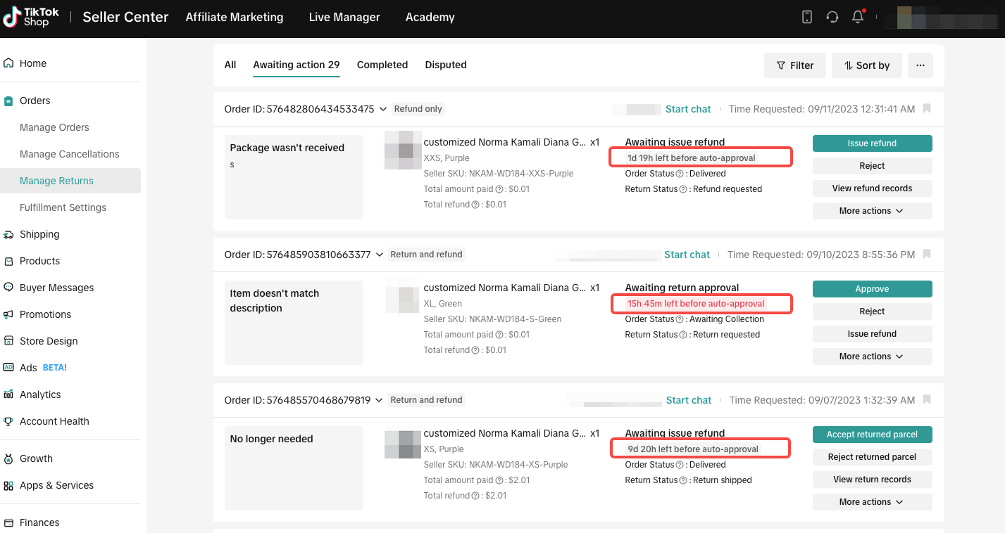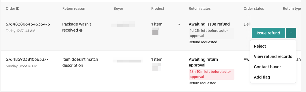 | 待处理 | “待处理”标签页会显示所有需要您批准或拒绝的退货/退款订单。我们根据不同处理场景重新调整了页面操作筛选器。![]() ![]() 同时,每个待处理订单都会显示剩余处理时效倒计时,提醒您及时处理以避免被平台自动批准。 ![]() ![]() ![]() ![]() 可执行操作: – 待审核退货申请:需先批准买家的申请,客户才能开始退货。 – 待确认退货包裹收货:退货申请已批准,正等待退货包裹送达。收到包裹或选择不要求退货时可批准退款。 – 待审核仅退款:买家未收到包裹时发起的仅退款申请。 – 上传证据:若客服团队审核您的申诉时发现证据不足,将要求补充凭证。您可在此标签页查看需要补充证据的申诉。 |