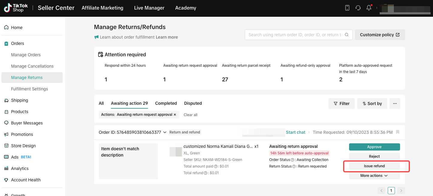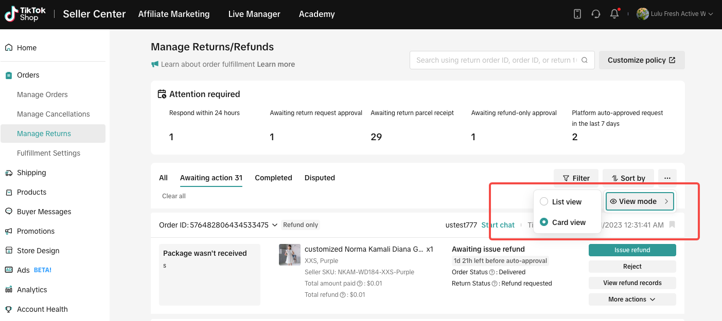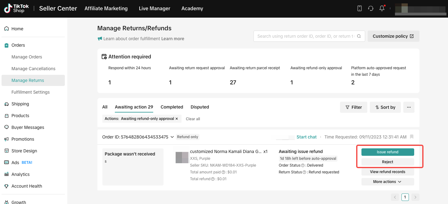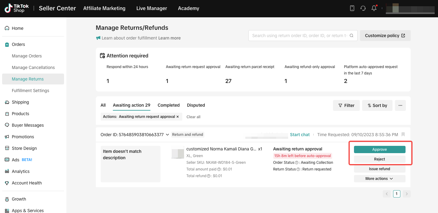 | 待处理 | “待处理”标签页会显示所有需要您批准或拒绝的退货/退款订单。我们根据不同处理场景重新调整了页面操作筛选器。![]() ![]() 同时,每个待处理订单都会显示剩余处理时效倒计时,提醒您及时处理以避免被平台自动批准。 ![]() ![]() ![]() ![]() 可执行操作: – 待审核退货申请:需先批准买家的申请,客户才能开始退货。 – 待确认退货包裹收货:退货申请已批准,正等待退货包裹送达。收到包裹或选择不要求退货时可批准退款。 – 待审核仅退款:买家未收到包裹时发起的仅退款申请。 – 上传证据:若客服团队审核您的申诉时发现证据不足,将要求补充凭证。您可在此标签页查看需要补充证据的申诉。 |
