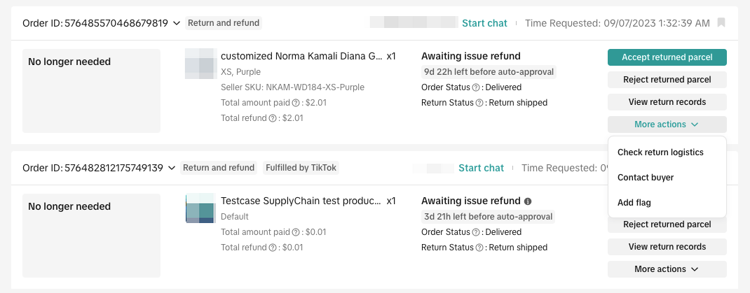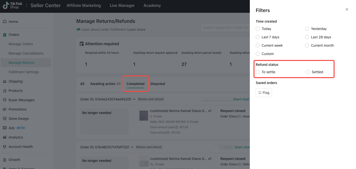 | 已完成 | “已完成”标签页包括了所有处理完毕的退货/退款订单,以及仍在退款流程中的订单。同时还包括买家取消退货/退款申请的订单以及申请被拒绝的订单。 我们提供两种筛选器,可帮助查找已退款或退款中的订单:“待结算”和“已结算”。 ![]() ![]() |