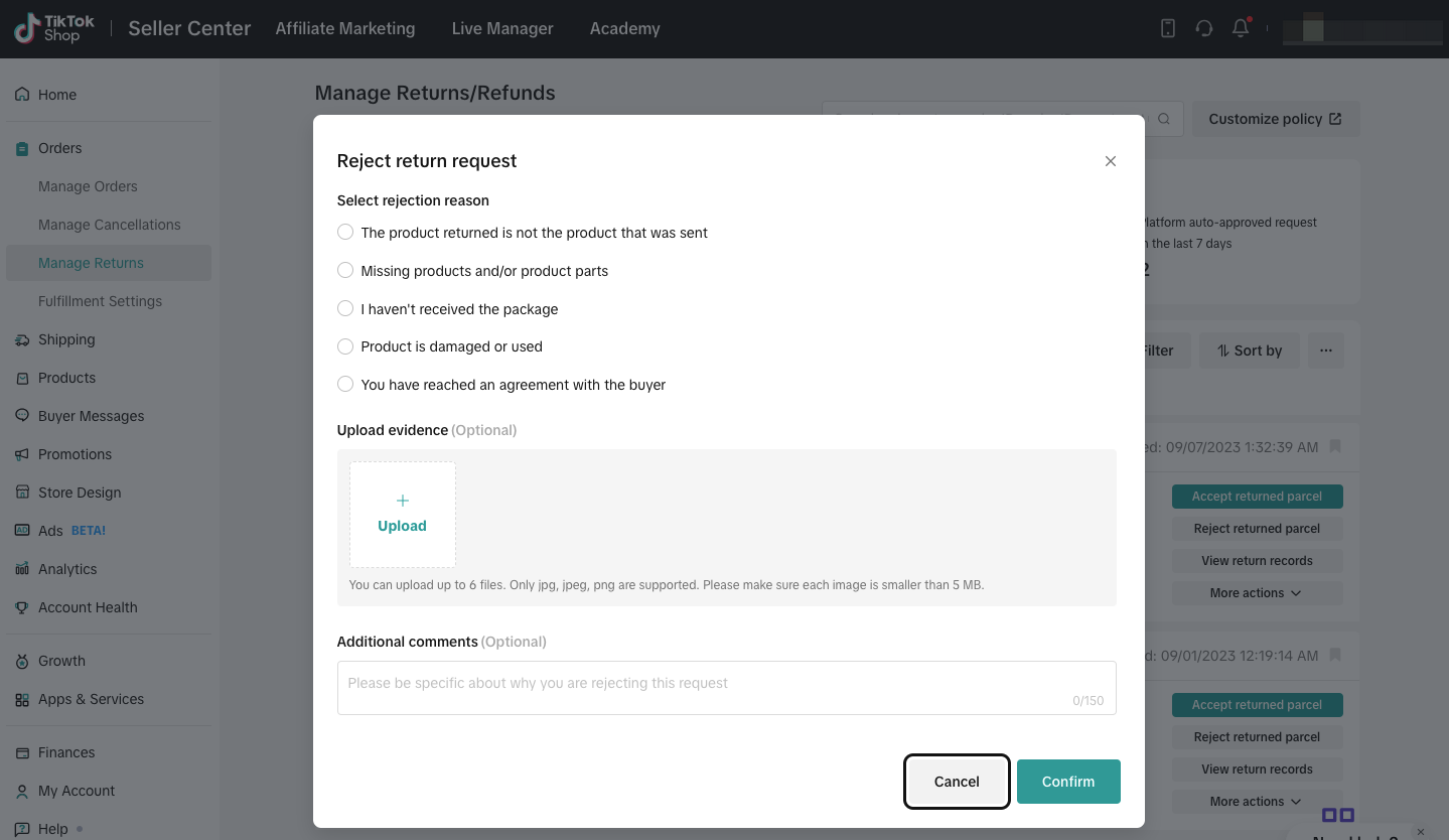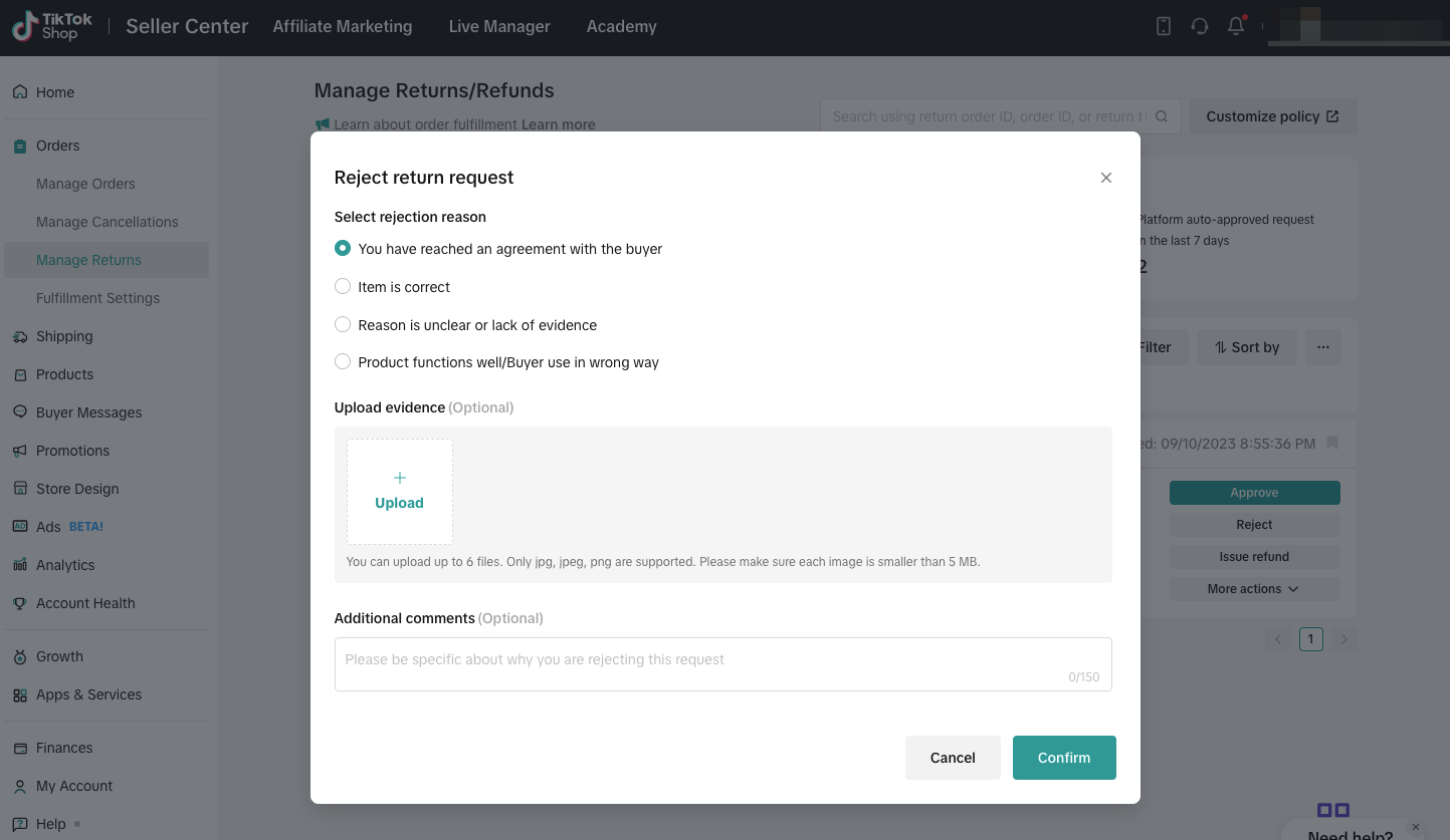 若选择拒绝,需选择拒绝原因并上传相关证明。这将有助于客服团队在买家发起仲裁时准确判断支持买家还是商家。