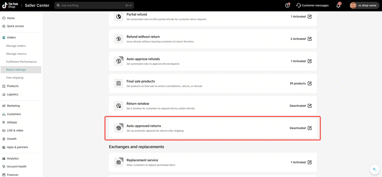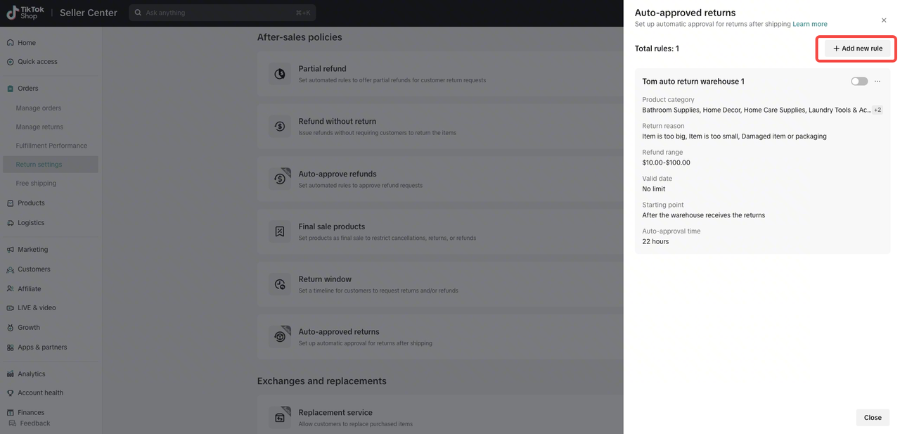 如果您是第一次使用,会看到一条提示:“为发货后的退货设置自动审核”。