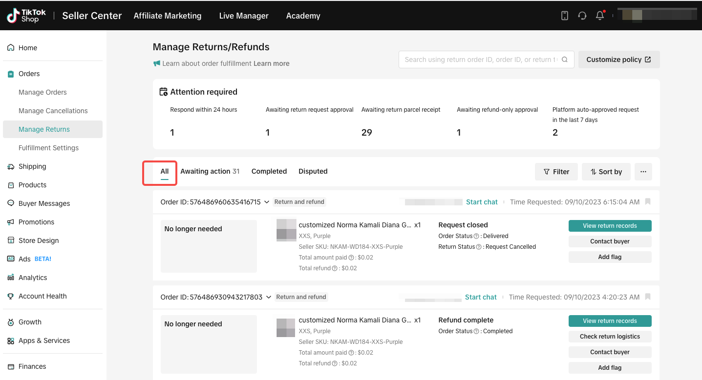 | 全部 | “全部”标签页汇总了所有买家发起的退货/退款订单。![]() ![]() |