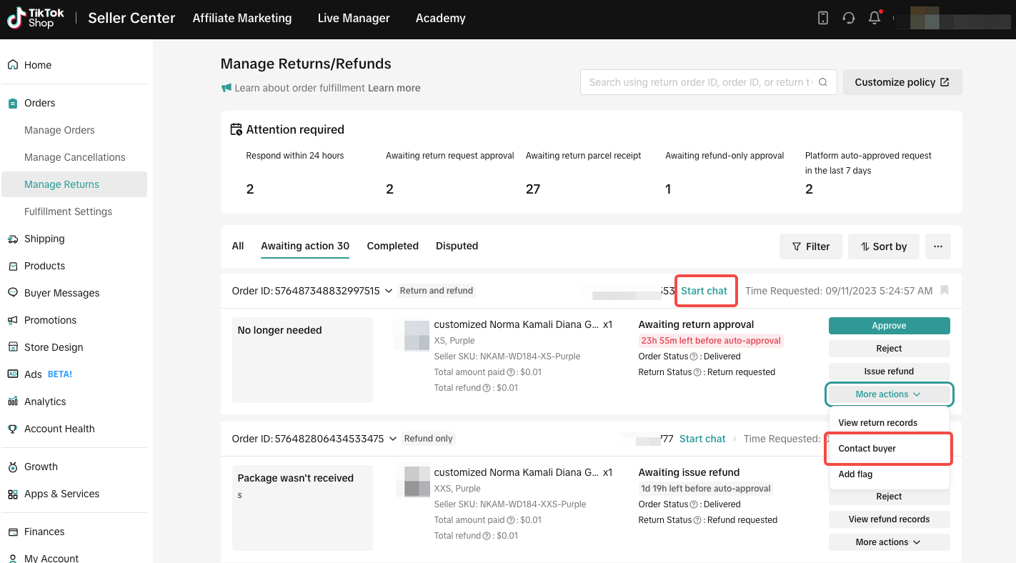 当收到退货或退款申请时,首先需确认买家提供的理由及提交的消息或图片是否符合退货或退款条件。若无法判定具体情况,可点击“开始聊天”或“联系买家”与买家沟通,获取详细信息或进行协商。