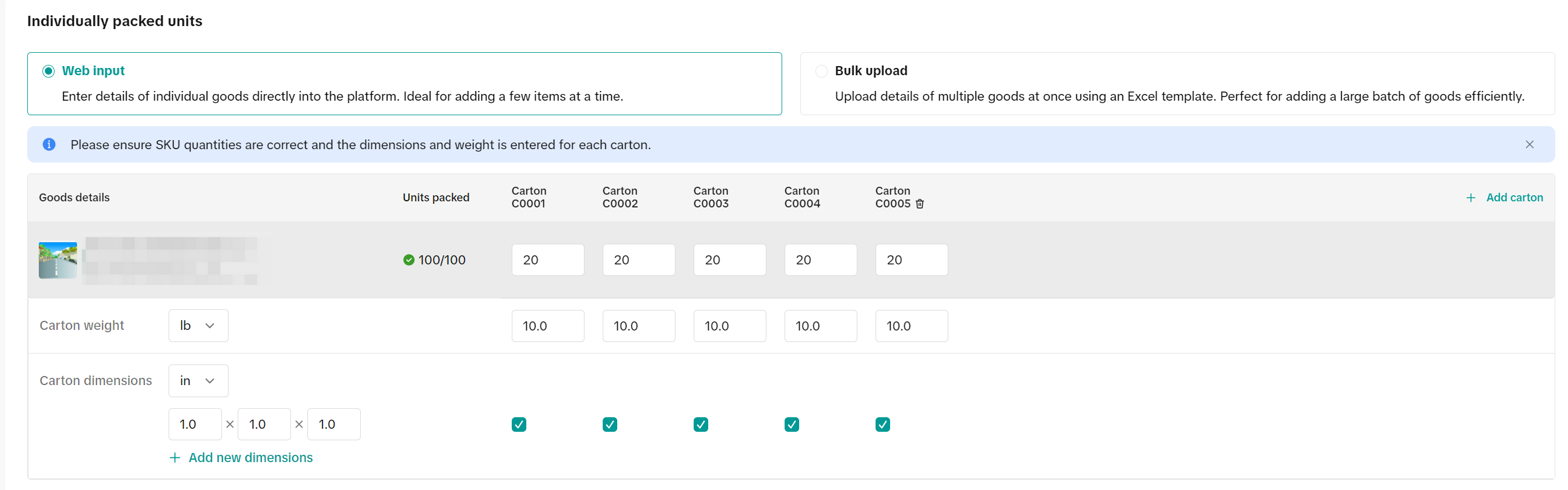 | 创建IBR(入库单)-纸箱管理( Manage Carton) | 1. 如果商家在添加货品时 箱规选择了【Individual Unit】,在填写装箱信息时确保,每箱的货品数量,箱子重量和体积信息一致。否则将无法使用安托收货功能。 | ![]() ![]() |