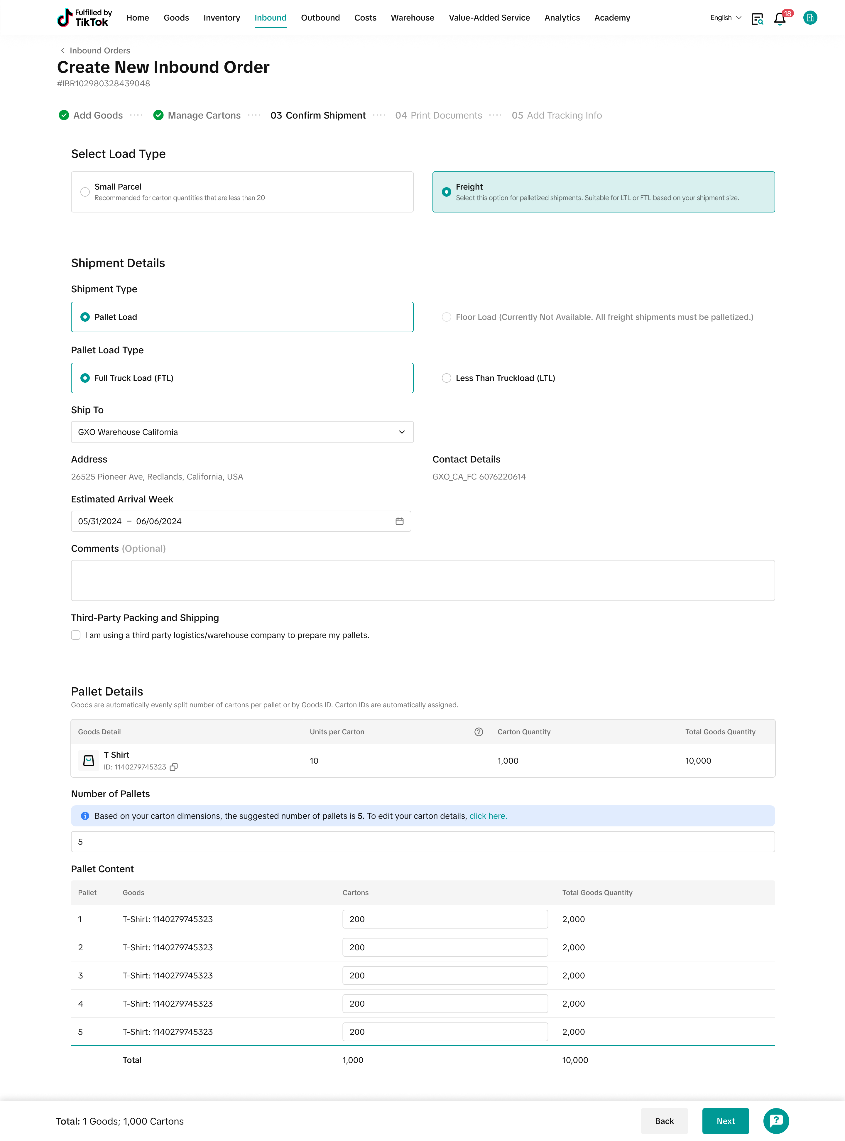 | 创建IBR(入库单)-确认发运(Confirm Shipment) | 1. 转载类型(Load type)选择Freight; 2. 输入发运信息: 1. Shipment type:选择托盘(Pallet); 2. Pallet load type:按照实际运输情况选择整车运输或者零担运输。 3. 输入托盘数量,系统将按照托盘数量自动分配每个托盘的箱子数量 4. 商家确认每个托盘的数量,并完成创建入库单。 5. 如果商家是由货代或海外仓操作打托且不能提供准确的打托信息,或想跳过按托盘收货流程继续选择使用箱唛入库,可在确认发运(Confirm Shipment) 填写托盘信息时,勾选【Third party packing and shipping】,填写海外仓或者货代名称,进行跳过。 | ![]() ![]() |