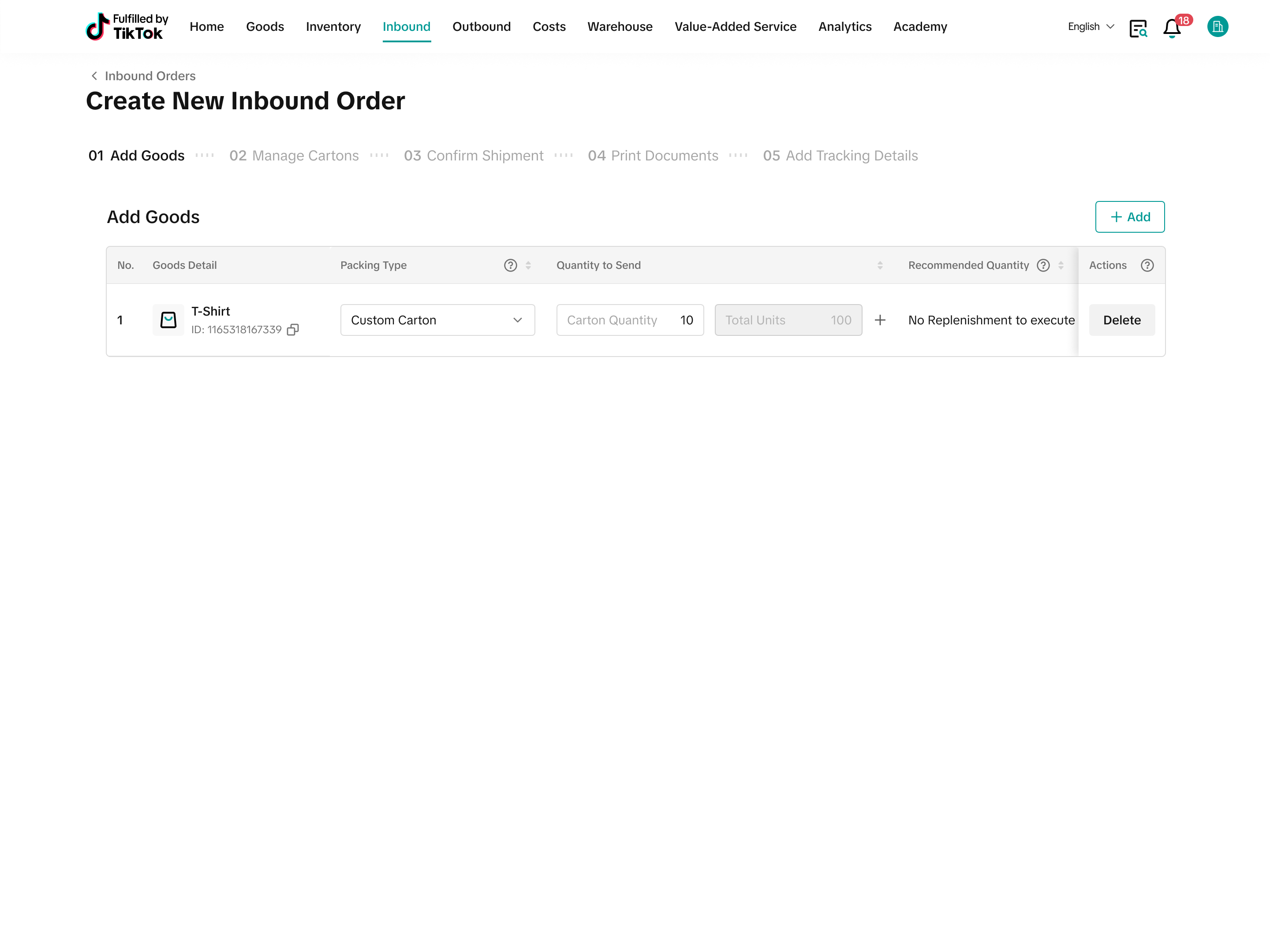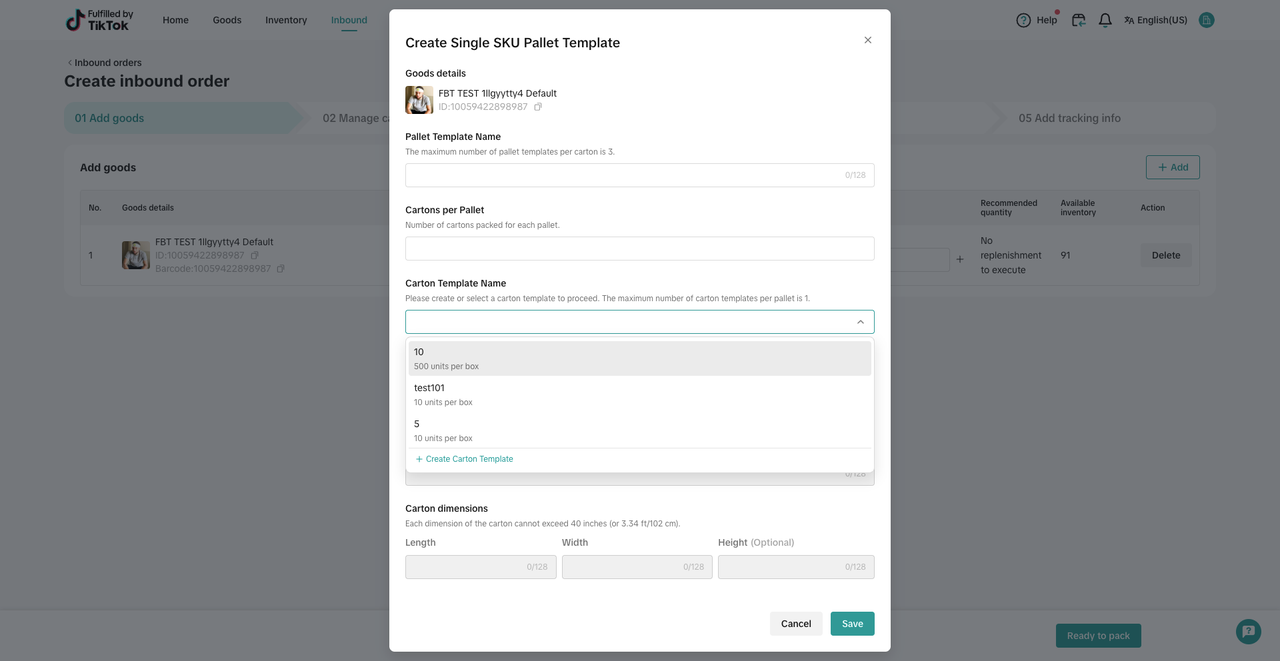 | 创建IBR(入库单)-添加货品(Add Goods)-主动选择托规触发按托收货 | 添加货品时主动选择托规备货,实现按托收货。 本期支持按产品维度自定义打托规格,针对有标准打托规格的产品进行维护后,后续补货可简化流程,且分仓将按照托盘维度。 创建托规: 1. Pallet Template Name(托规名称):商家可自行编辑,方便辨别和记忆; 2. Cartons per Pallet(每个托盘上纸箱数量):商家需要按照实际托盘上装载的纸箱数量进行填写; 3. Carton Template Name(箱规名称):如果已经按照2.1管理商品装箱规格流程完成箱规创建,可以直接选择需要使用的箱规信息。如果没有创建,可以点击“Create Carton Template”并参照2.1完成箱规创建。、 选择使用托规需注意: 1. 使用标准托盘进行补货的SKU,每次补货计划不得少于4个托盘! 2. 单个入库单不能多余5个SKU; 3. 使用托规创建入库单时请确保实际打托的商品数和箱数与系统填写托规保持一致,否则会导致入库数量差异。 | ![]() ![]() ![]() ![]() |