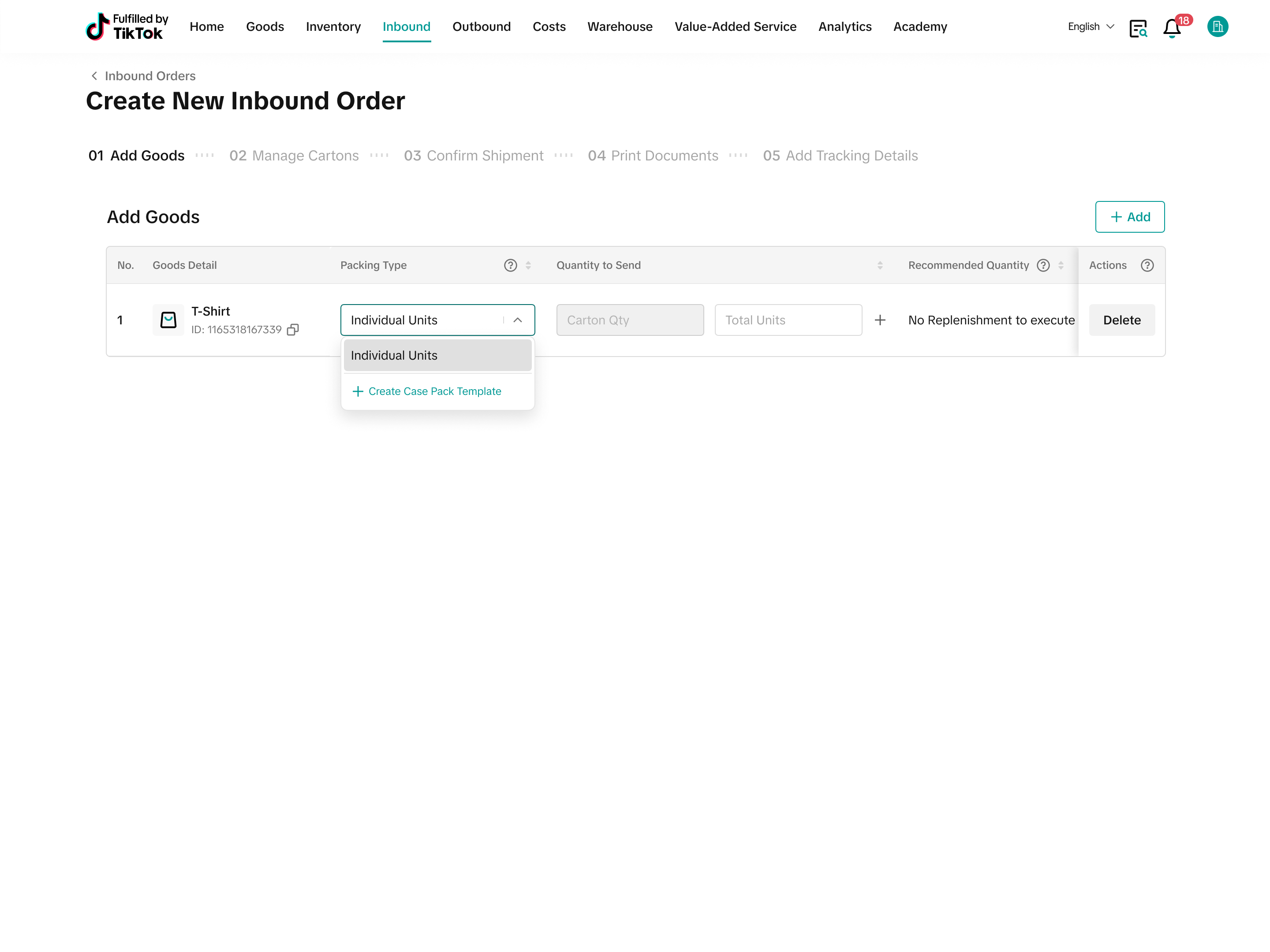 | 创建IBR(入库单)-添加货品(Add Goods)-满足条件自动触发 | 1. 创建入库单,添加货品时,只能选择【1个Goods】(主动选择托规一个入库单最多可以添加5个SKU) 2. 选择”Create Case Pack Template” 或者选择已经存在的箱规模板。商家只可为这个货品选择【1种】箱规模板。 | ![]() ![]() ![]() ![]() |