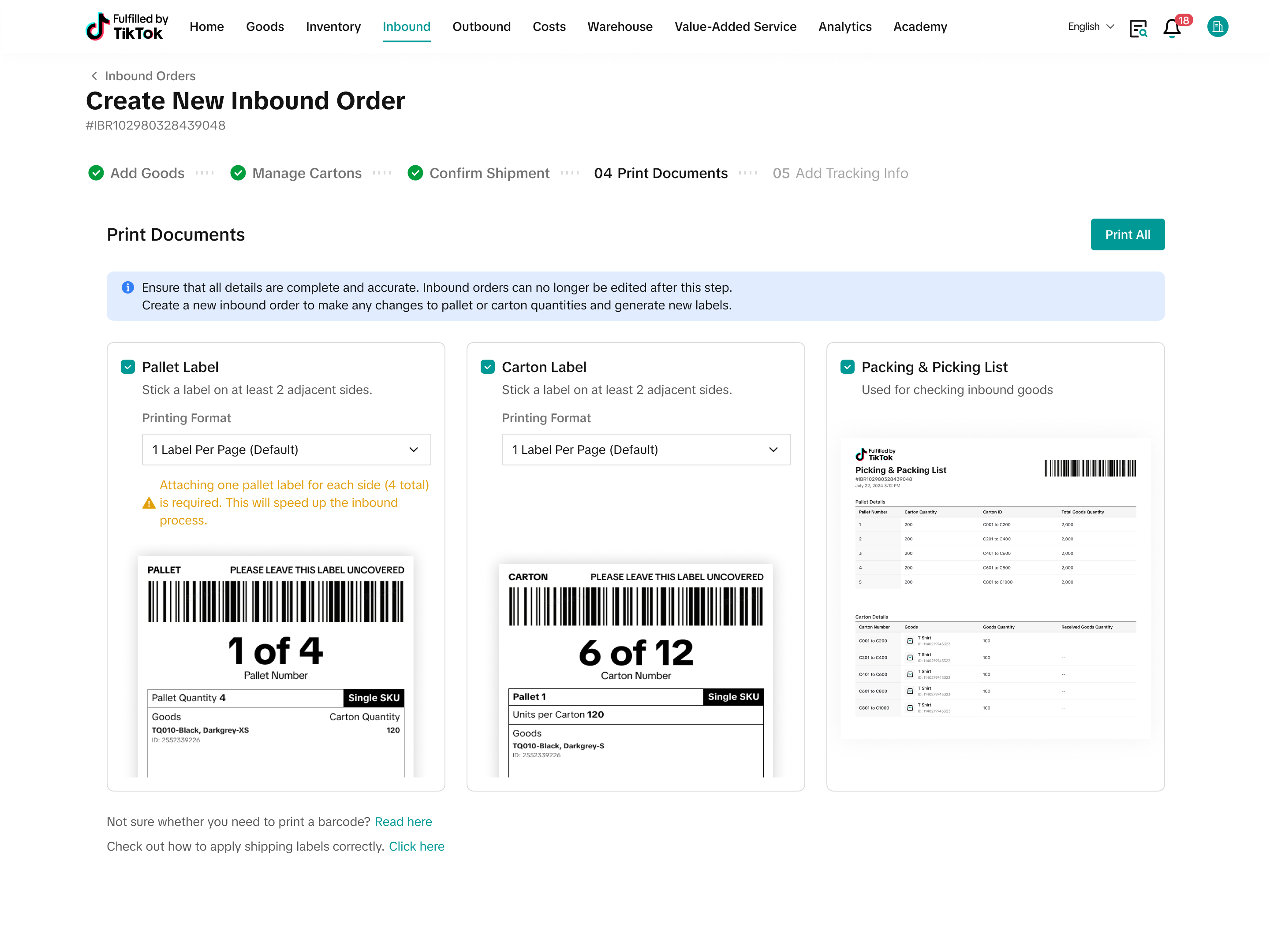 | 创建IBR(入库单)-文件打印(Print Documents) | 1. 如果你的IBR满足按托盘收货要求。商家必须打印托唛进行粘贴。 1. 箱唛打印即粘贴要求:参考入库操作手册 1.4 ACCU&CCCU – FBT入库规范及系统操作指南_v2.4 2. 打托要求:按照箱唛上的Pallet号码,将同一个托盘上的箱子打托在一个托盘上。入仓托盘最大尺寸长宽高限制为:48x40x72inches,包含托盘本身高度,重量限制为1500lbs(约680kg),不支持双层托盘; 3. 托唛粘贴要求:商家必须从FBT系统中下载FBT托唛,不允许使用其他第三方托唛来代替。每个托盘需要粘贴【4张】托唛,在托盘的4个面进行粘贴。托唛打印使用最小打印尺寸为10cm*15cm(4” x 6”)大小的纸张进行打印。 注意:托唛上的托盘号需要和此托盘上纸箱上箱唛上的托盘号一致。 | ![]() ![]() ![]() ![]() |