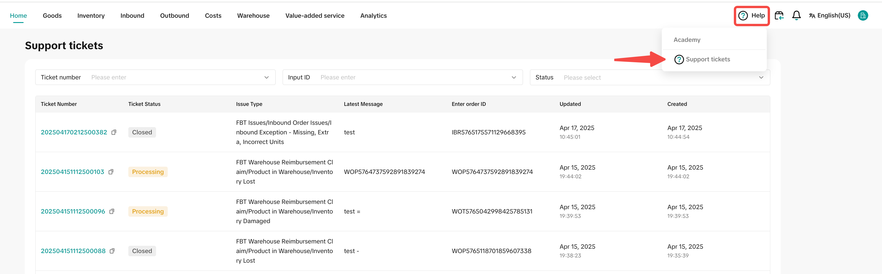 | 2 | 工单进度查询 | 商家可以通过FBT系统右上角的问号图标进入 工单中心,查看所有FBT工单进度 | ![]() ![]() |