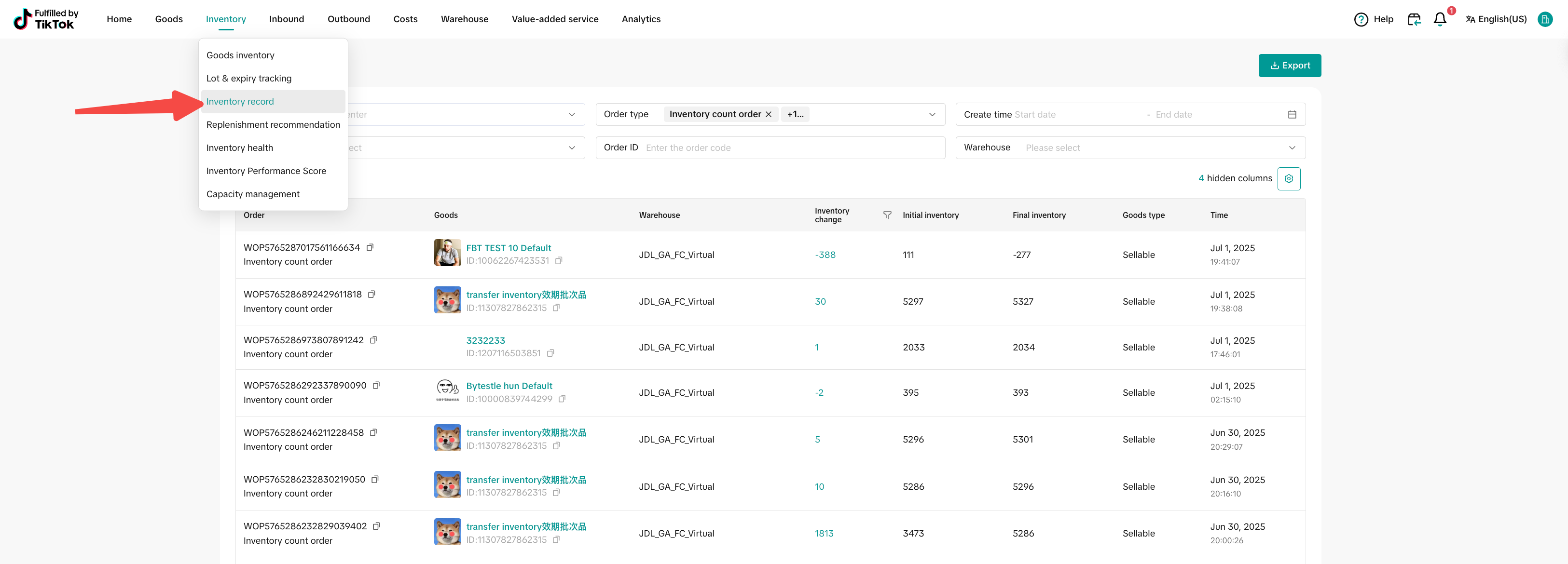 | 2 | 库存调增 | – Inventory record页面输入存在数量短缺的Goods ID – 筛选 Order type – Inventory count order和 Inventory quantity adjustment order,并计算库存调整总量 – 该部分遗漏上架/数量短缺的库存,因无法关联到对应的IBR,未在IBR维度完成上架,通过库存调整单(Inventory count order和 Inventory quantity adjustment order)调增Goods维度可用库存。 | ![]() ![]() |