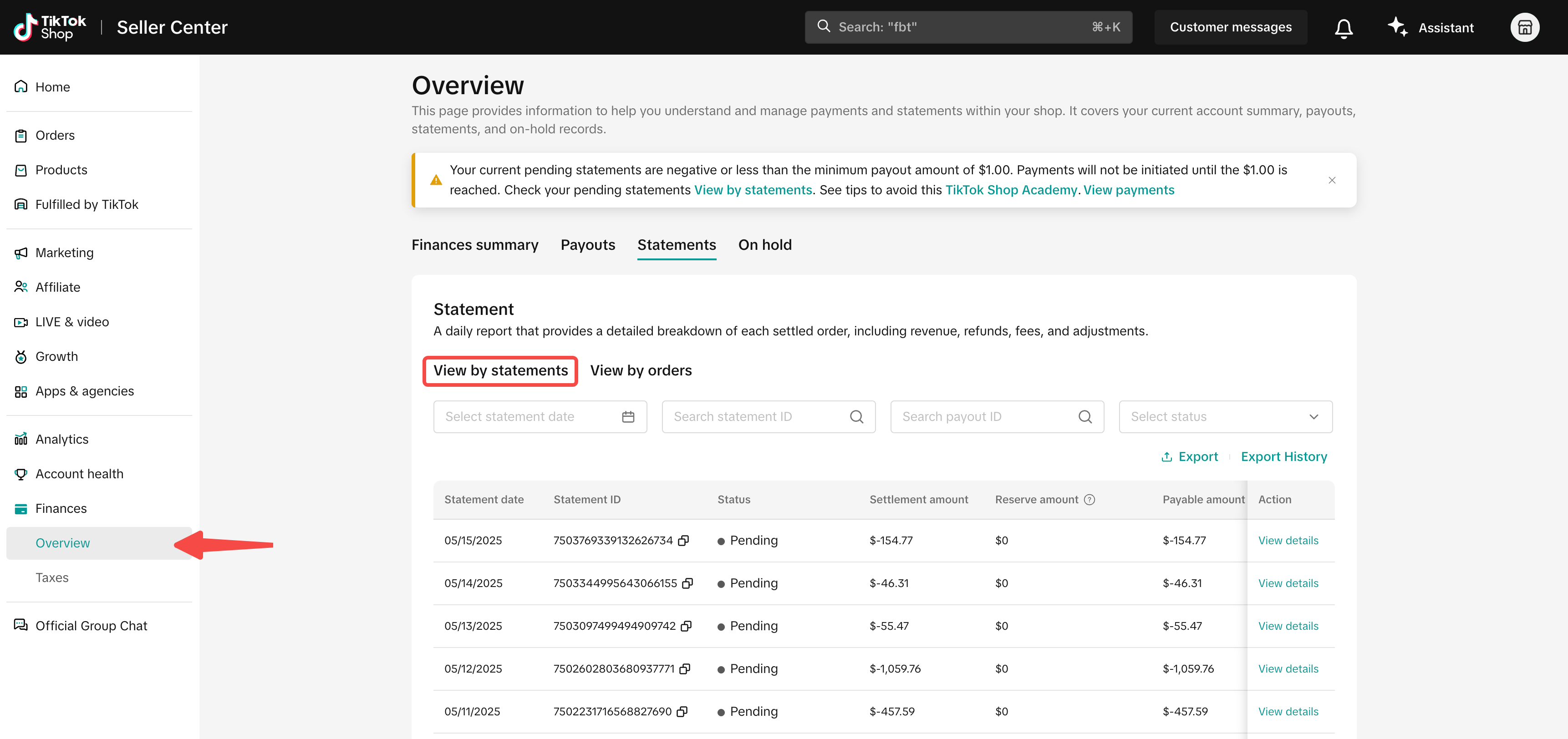 | 2 | 报销记录查询 | 不管是商家创建的报销工单,还是TikTok自动发起的报销,商家都可以在报销发起后5个工作日内,在 Seller Center-Finance-Overview-View by Statements 中查看到报销进度 | ![]() ![]() |