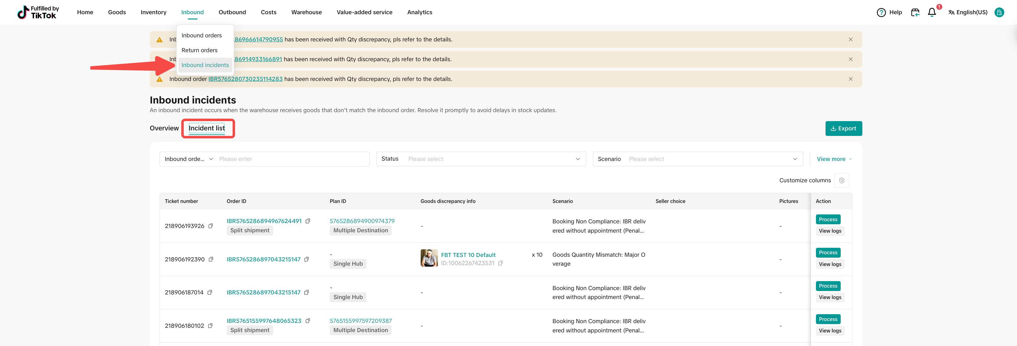 | 1 | 入库异常 | – Inbound incidents 页面输入存在数量短缺的IBR#或Goods ID – 查看是否存在以下情况导致的入库数量短缺 – 入库异常未处理,IBR未全部完成上架 – 因入库异常商家已新建IBR上架,货品未在原IBR完成上架 – Goods Quantity Mismatch-Shortage:少送货 – Goods Damaged upon arrivals:货物破损 | ![]() ![]() |