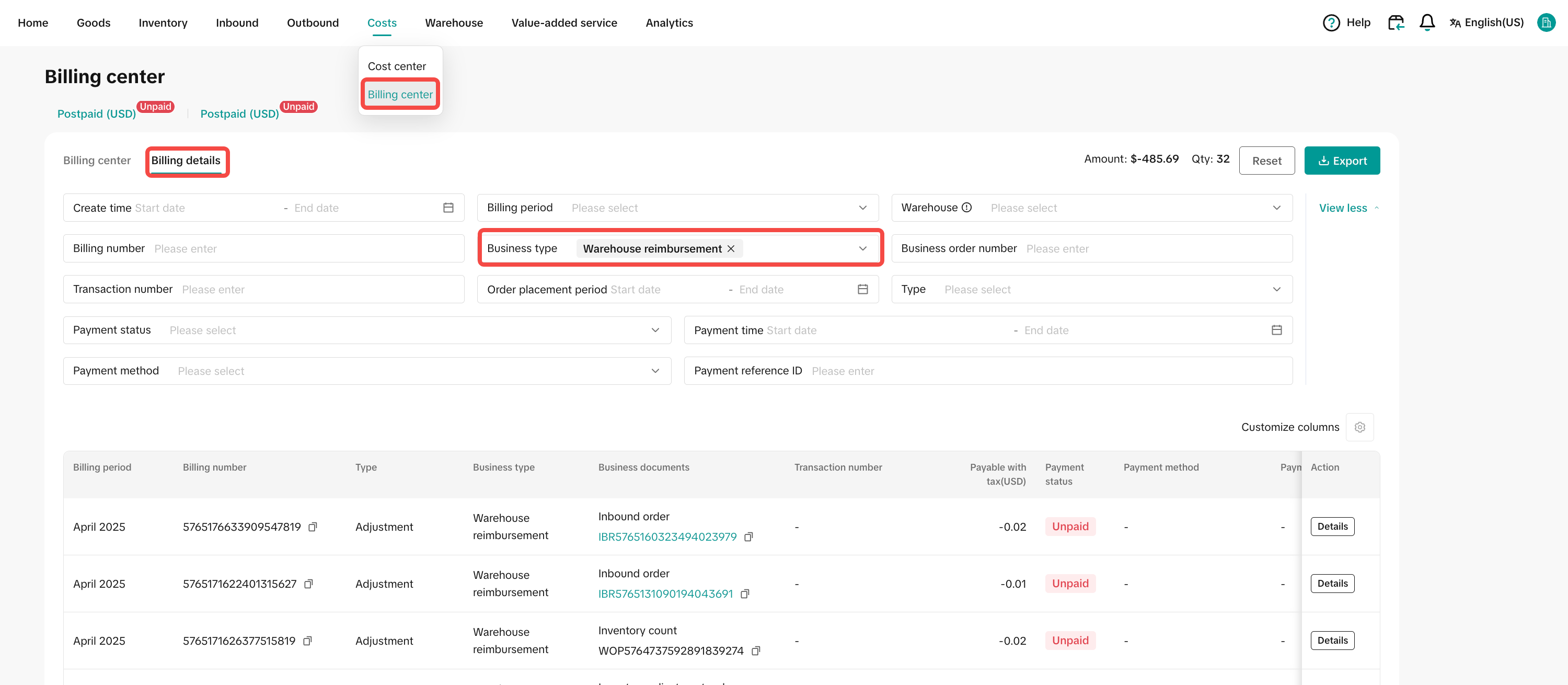 | 3 | 报销记录查询 | 对于已批准的报销,商家可在报销后15个工作日内,在FBT系统Billing center > Billing details板块查询所有报销记录 | ![]() ![]() |